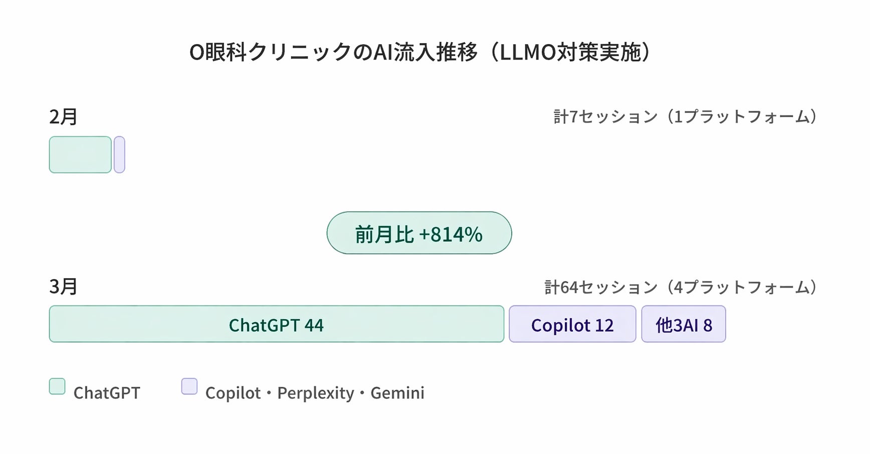LLMO対策実施クリニック1院では、前月比+814%の成長、1→4プラットフォームへの流入元拡大の事例を確認