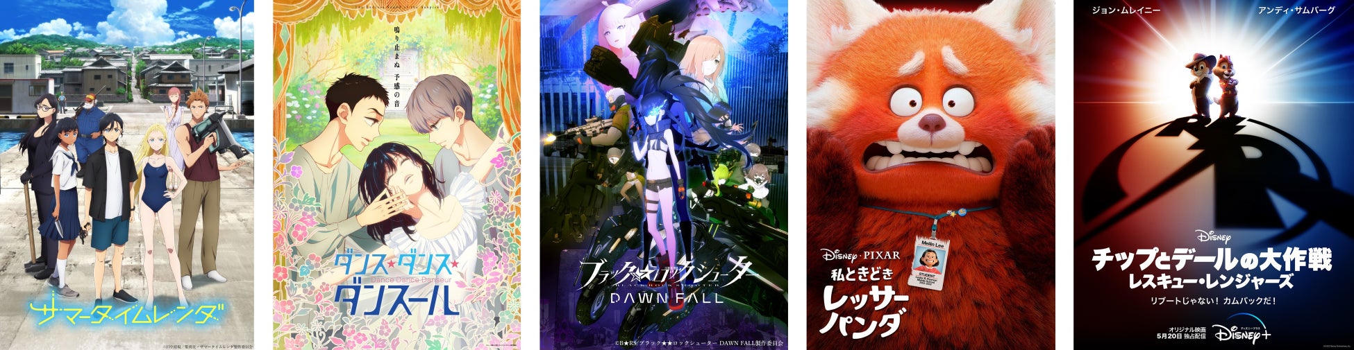 ディズニープラスで楽しめる番組の中から、『サマータイムレンダ』、『ダンス・ダンス・ダンスール』、『ブラック★★ロックシューター DAWN FALL』、『私ときどきレッサーパンダ』、『チップとデールの大作戦 レスキュー・レンジャーズ』などの作品を中心に特集します。