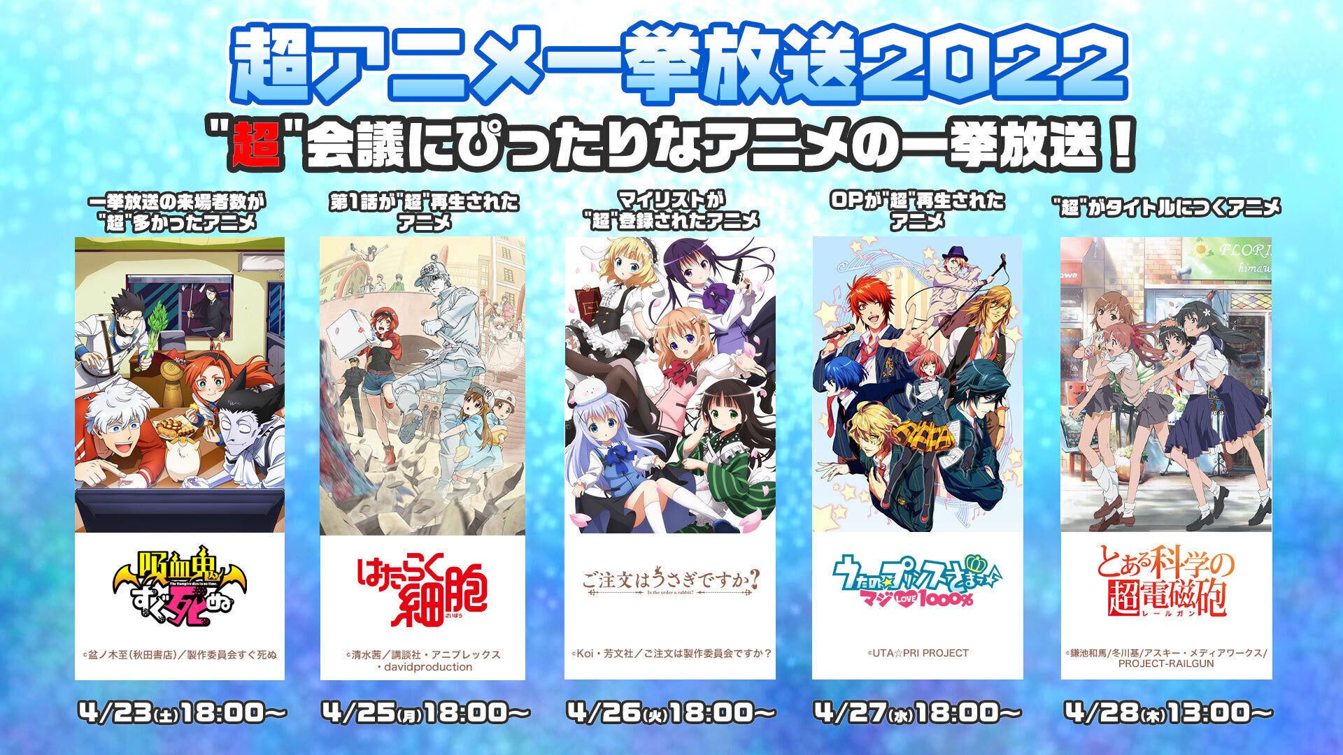 一挙放送の来場数が“超”多かったアニメや、第1話が“超”再生されたアニメなど、“超”の付くイベントにぴったりなアニメの一挙放送が決定しました。ニコニコなら、ストーリーを楽しむだけでなく、流れるコメントを通じてユーザー同士盛り上がりを共有することでより一層視聴を楽しめます。