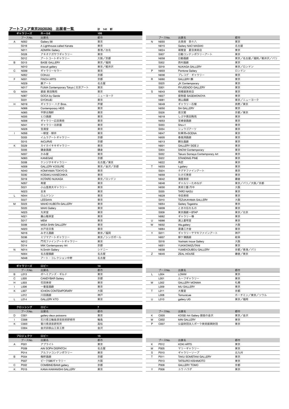 ART FAIR TOKYO 20の出展ギャラリーは下記の通りとなります。