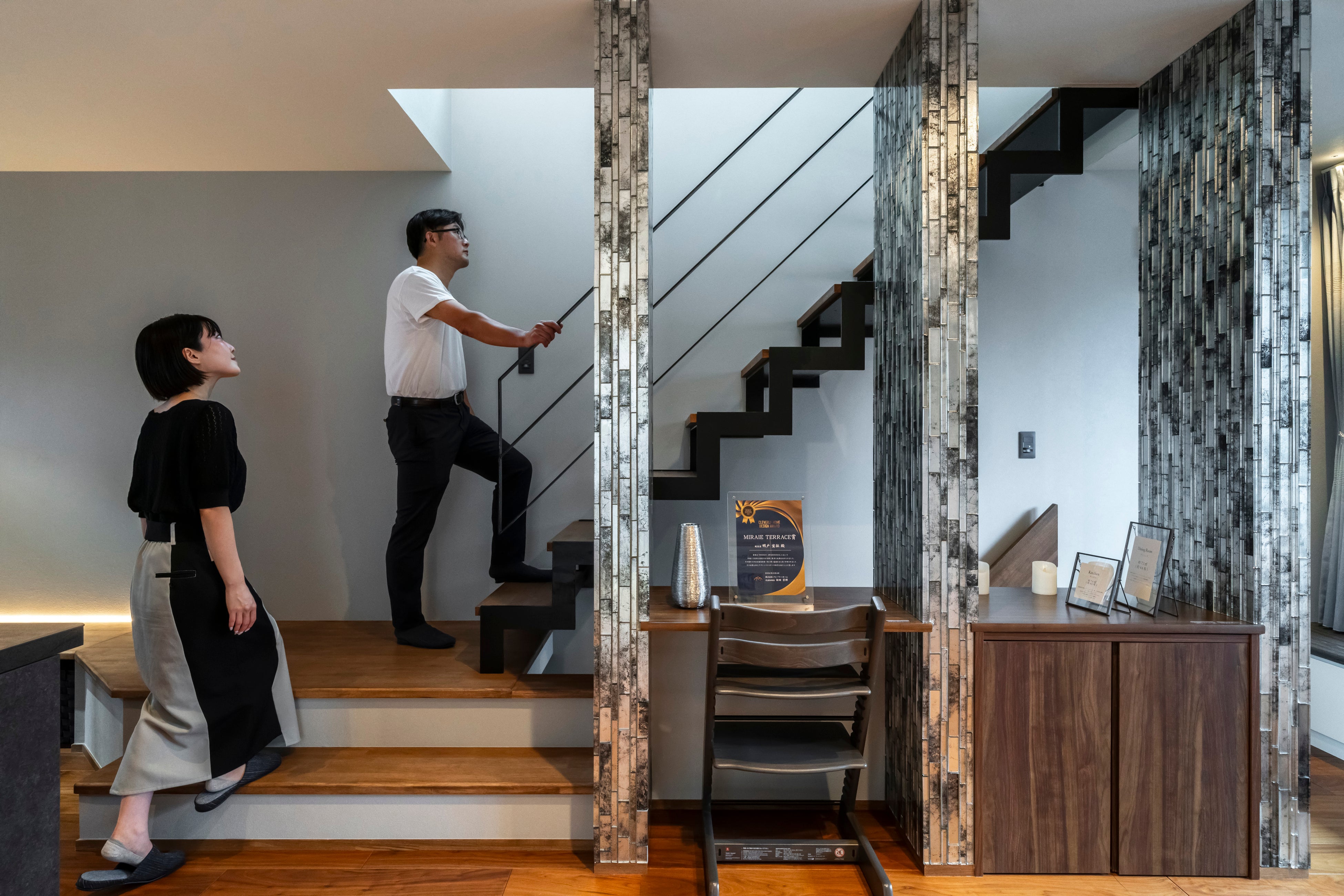 木造軸組みの構造計算、そして接合金物など構造材に当社の最新技術を採用し、エントランスから3階まで一直線に伸びるダイナミックな吹き抜けと、宙に浮くブリッジ状の廊下が限られた敷地であることを忘れるような「圧倒的な抜け感」を演出しています。