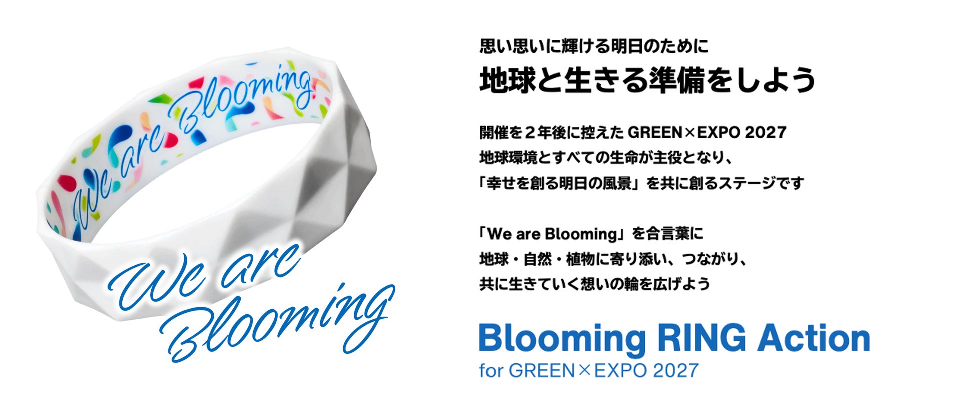 GREEN×EXPO 2027の開催に向けて、『Blooming RING Action』が、本日からスタートします。私も着けていますこのブルーミングリングがいろいろな場所に広まり、多くの人に身に着けて頂いて、GREEN×EXPO 2027を応援する、つながりの輪に加わっていただけるとうれしいです。