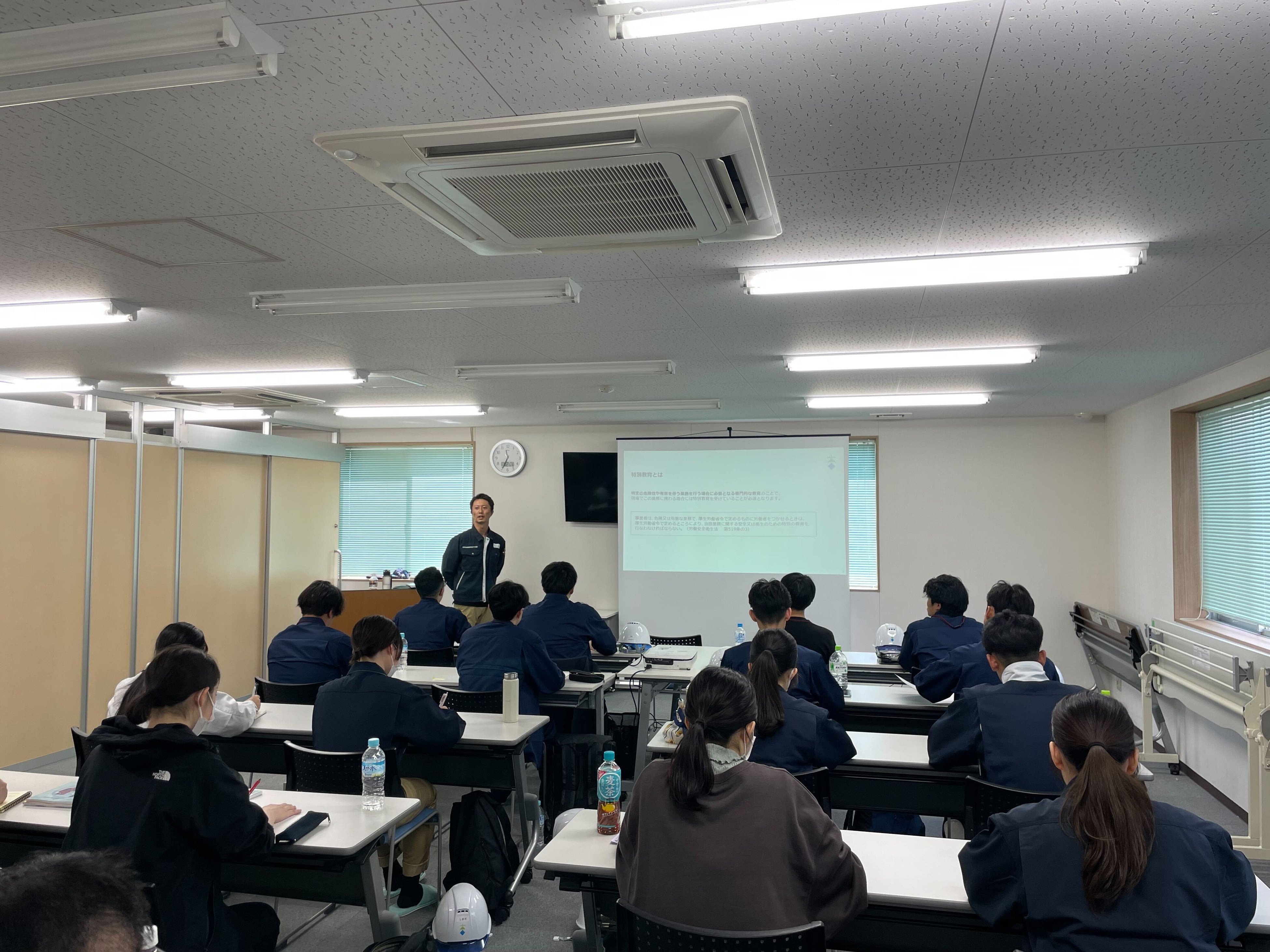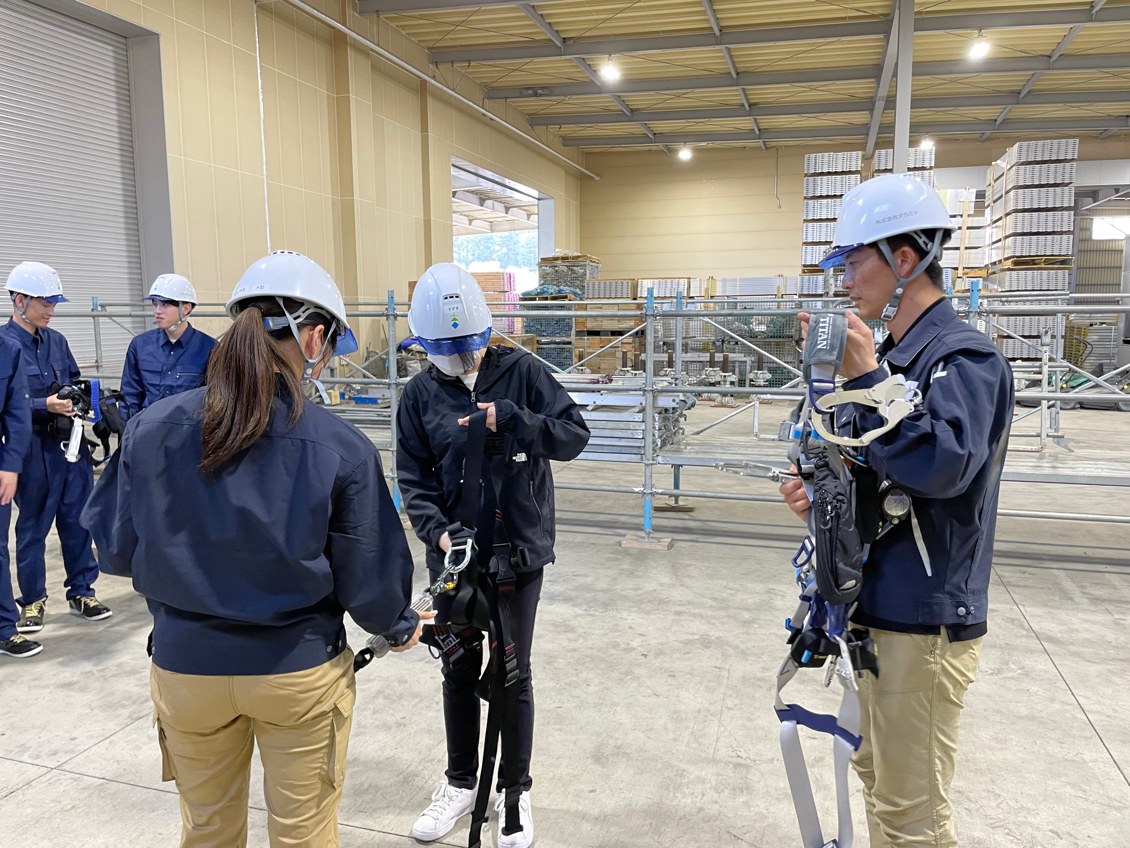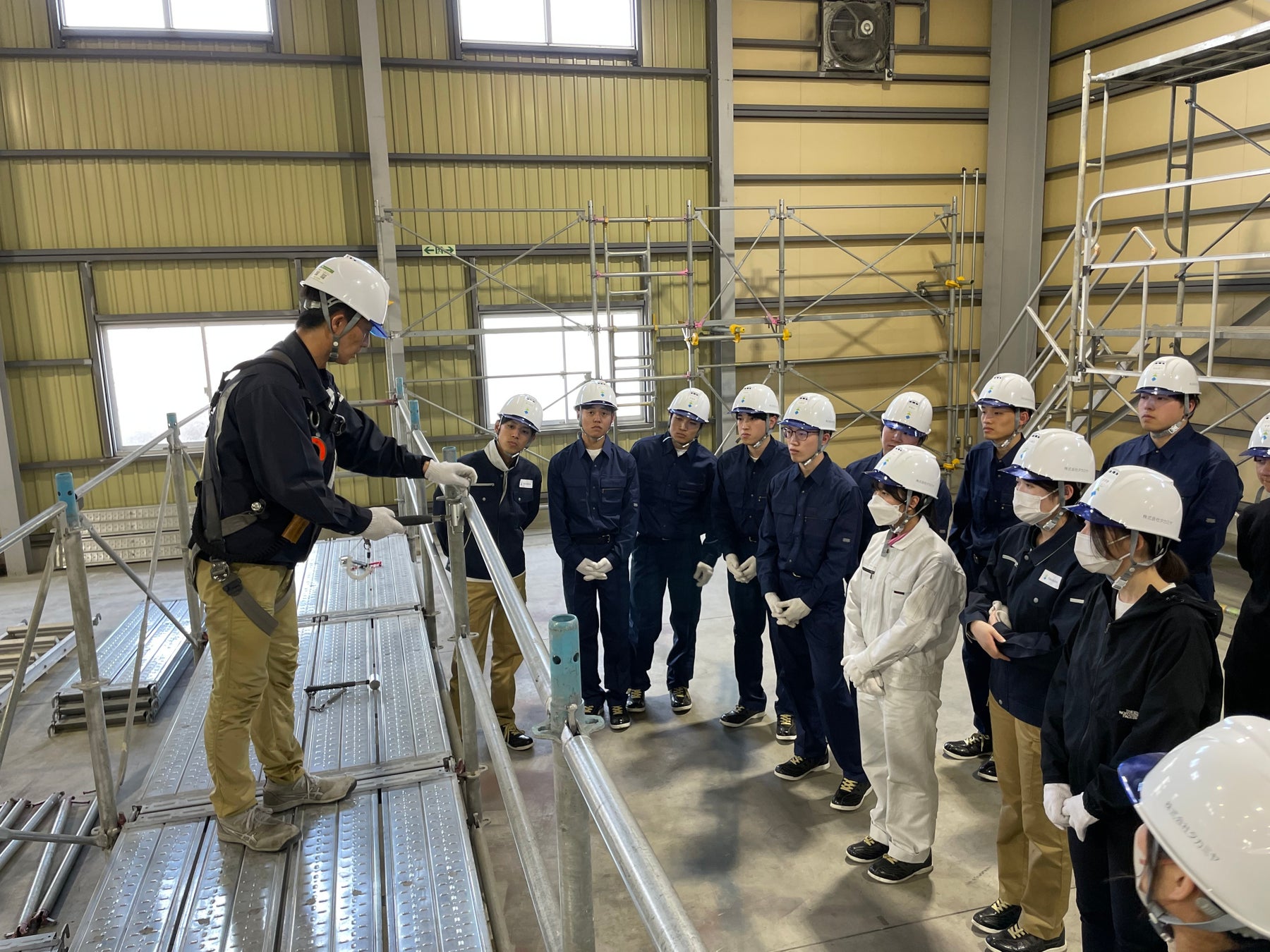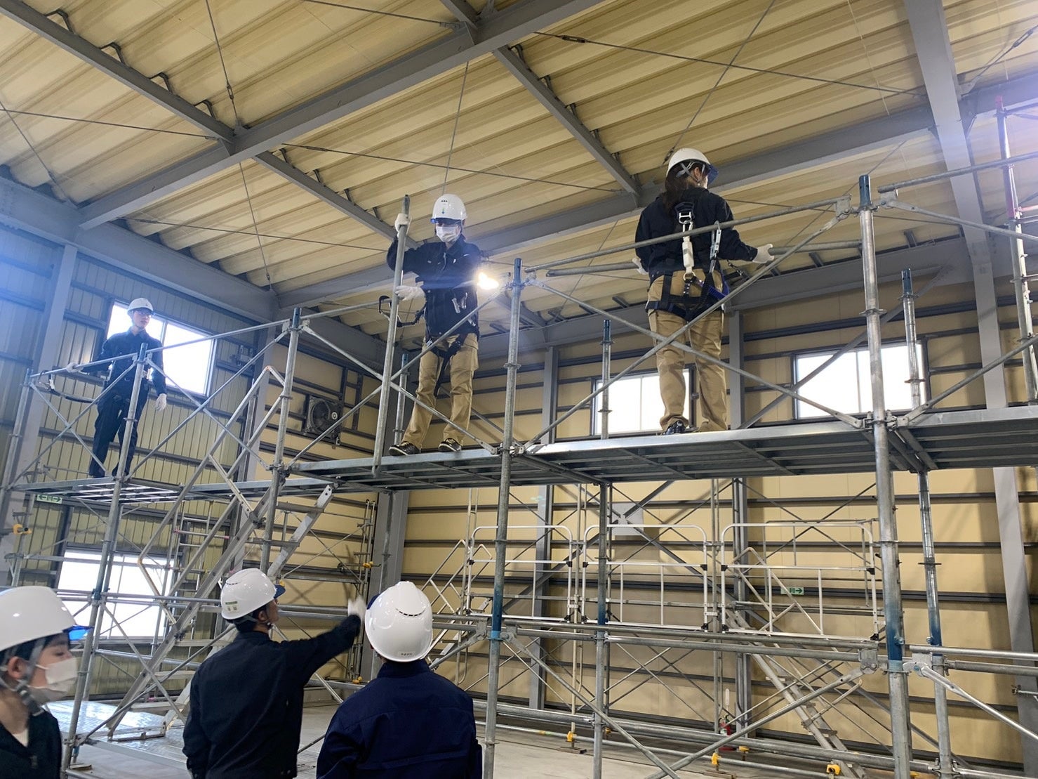 当社が運営する2か所の機材拠点で実施しています。墜落制止用器具や関係法令などの座学講義や仮設機材の見学を行った後、実際にフルハーネスを着用しての高所での作業教育、足場の組み立て等の教育を行いました。