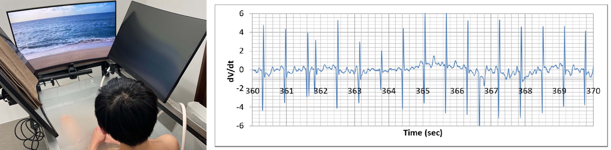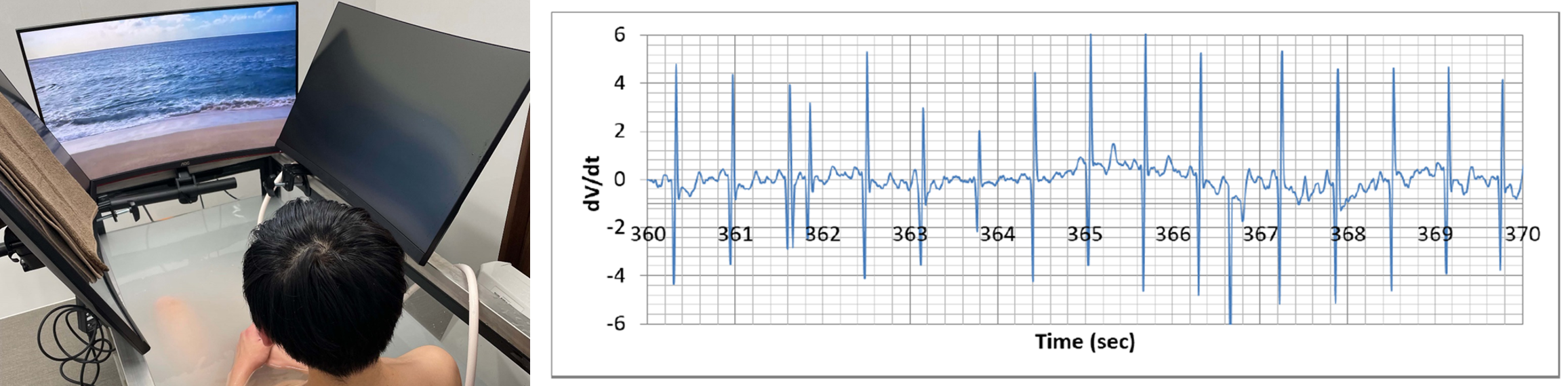 入浴中は体が自動で洗浄されながら、カプセル内の環境下で入浴者がに五感により変動するデータを取得し、主たる変動要素からより良質な状態へ導く技術を研究しています。上記(右)グラフは、入浴中の映像再生による心拍計測データです。従来のバスタイムが、本当の意味での身体のメンテナンスタイムとなります。