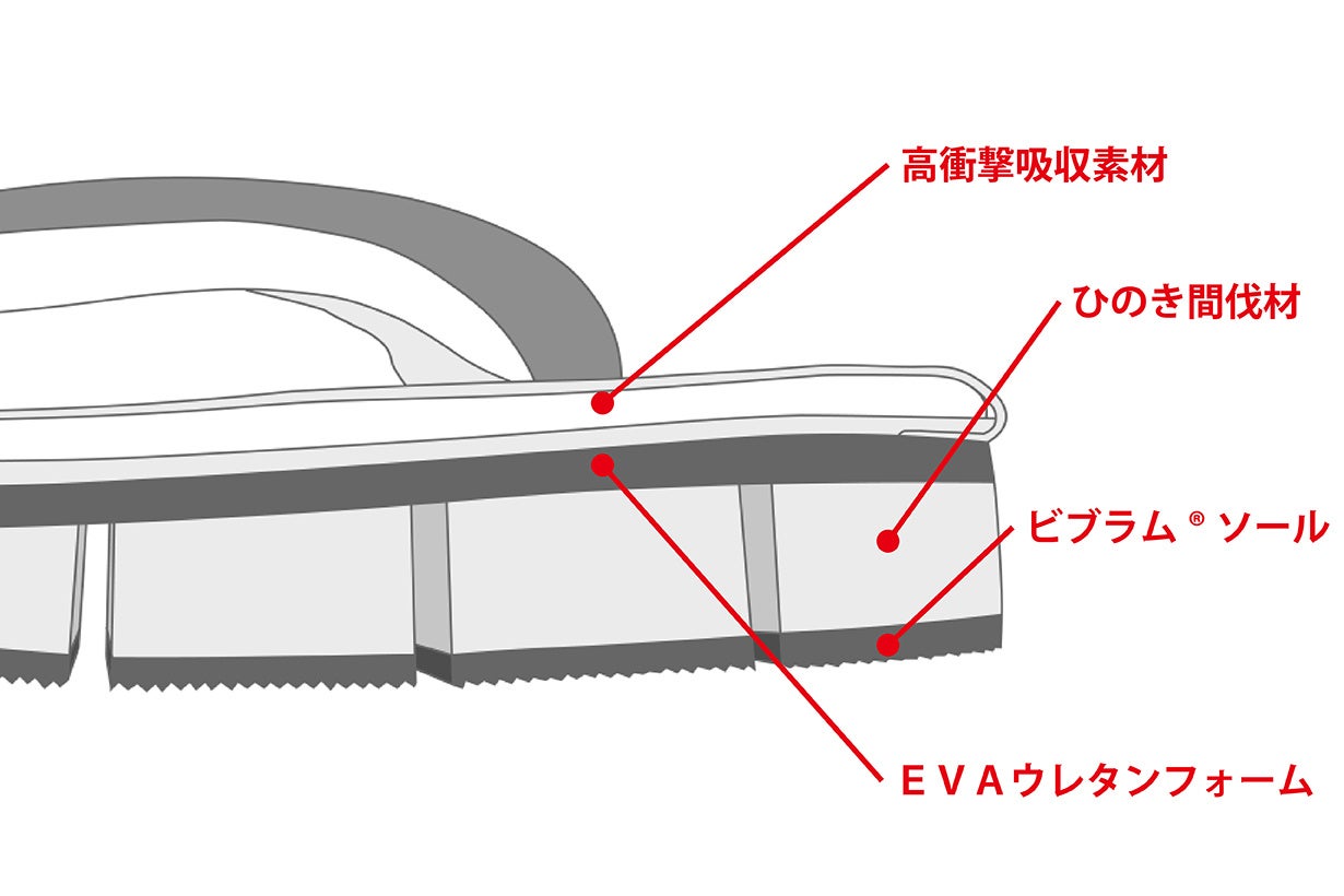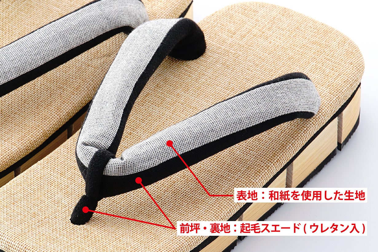 足をのせる部分に「表」と呼ばれるクッション入りのパーツが取り付けられていますが、インナーパーツにスポーツシューズなどにも使用される高衝撃吸収素材を採用したことで、履き心地と耐久性の向上に成功しました。