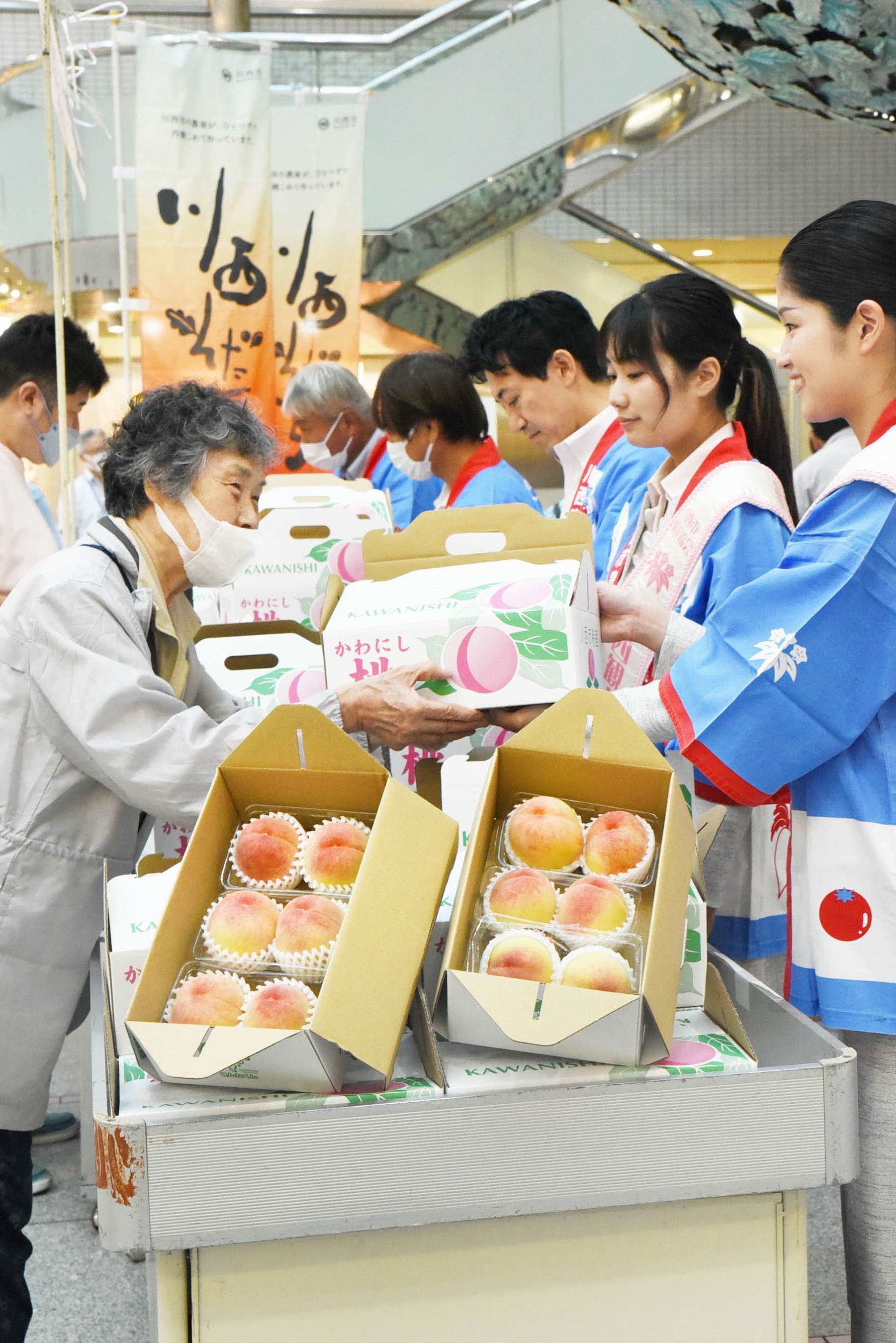 長蛇の列の先頭に並んでいた原田 本子さん(はらだ もとこ)は「毎年、川西の桃の即売会が楽しみで買いに来ていました。今年は久しぶりの開催でとても嬉しいです。家族で食べるのがとても楽しみです。」と話していた。