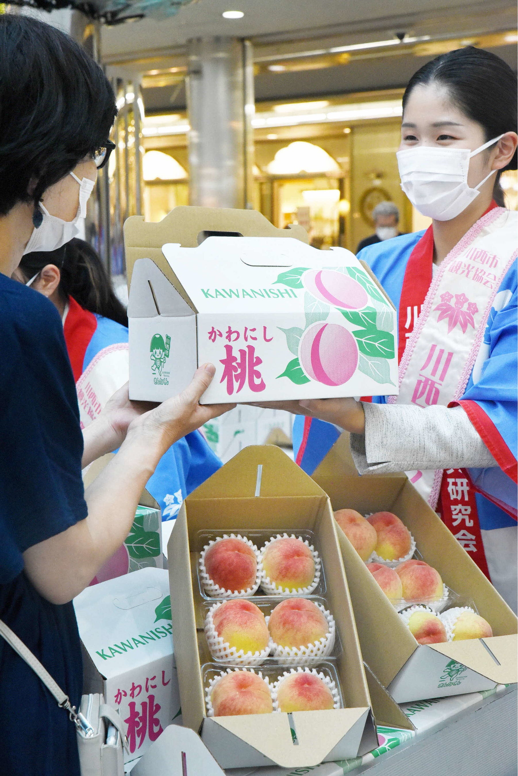 売り子として、川西観光プリンセスの眞野 梨穂奈さん(まの りほな)、福場 莉帆さん(ふくば りほ)も駆け付け、桃の販売に汗を流していた。