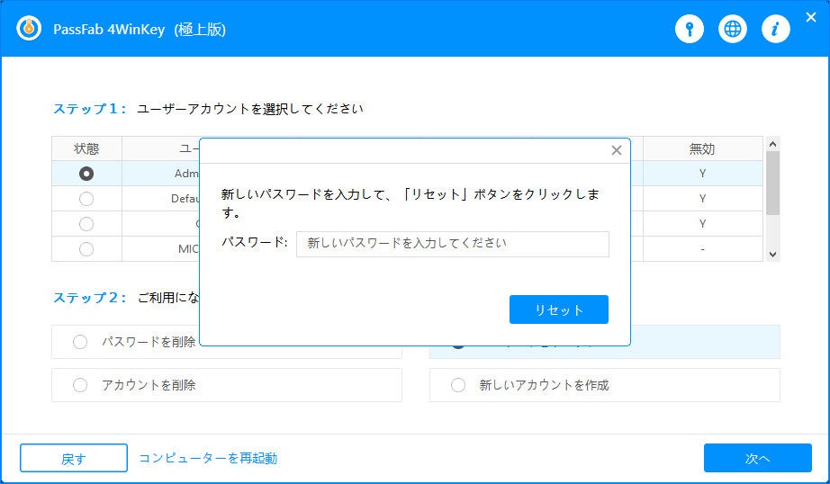 5.PassFab 4WinKeyが立ち上がります。Windowsシステムとユーザー名、「パスワードをリセット」を選択します。