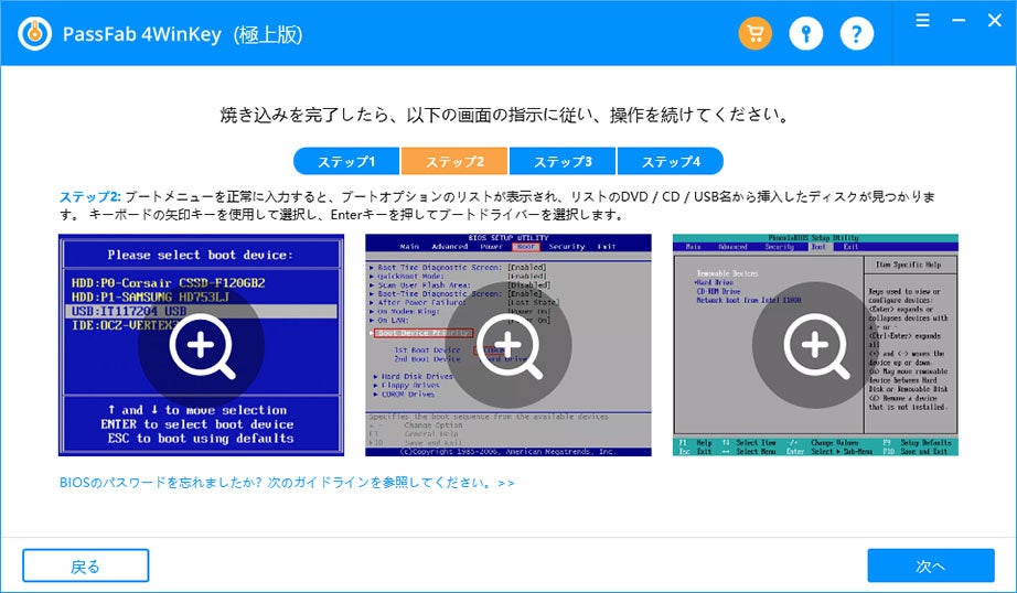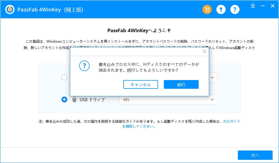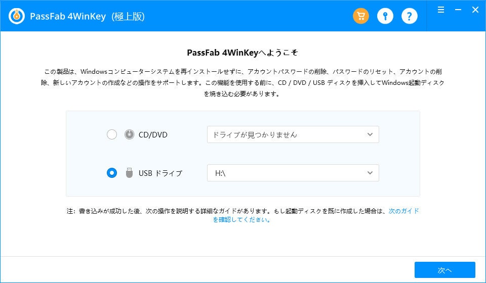 パスワード解除専門ツール「PassFab 4Winkey」であれば、PCの初期化を行うことなく、実行することが可能です。正常なPCからリセットディスクを作成します。リセットディスク作成時にガイダンスが表示されるため、簡単に実行することが出来ます。