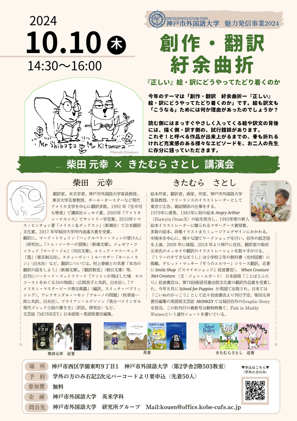 作品を取り入れながら対談形式で行います。読者にとって分かりやすい絵や訳文が出来上がるまでの楽しいけれど骨も折れる試行錯誤など、創作・翻訳時における語学・文学との関わりの愉しさを語っていただきます。