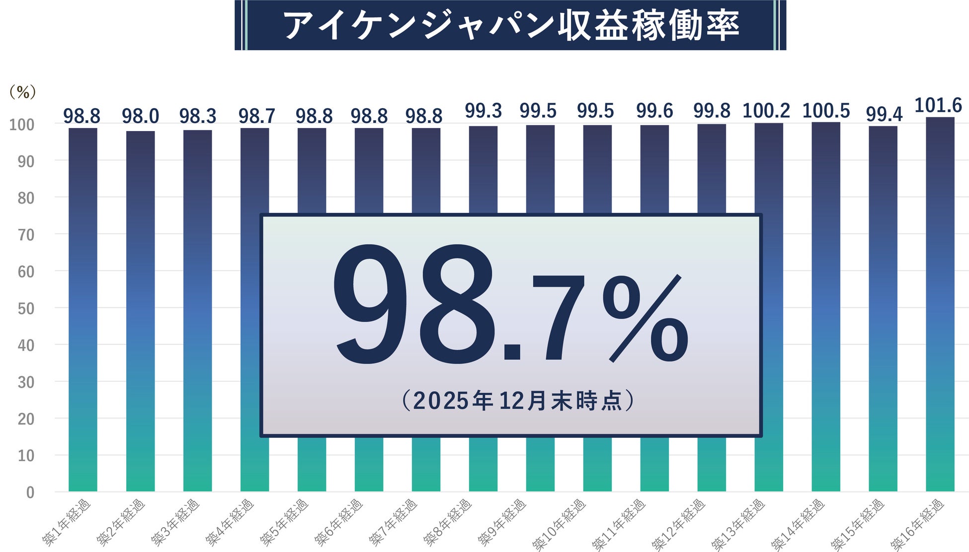アパート・マンションの企画・販売・賃貸管理を行う株式会社アイケンジャパン(本社:福岡県福岡市中央区/東京都港区、代表取締役:中島 厚己)は、2025年12月末時点における自社施工・自社管理物件の「収益稼働率®」が98.7%を達成しました。