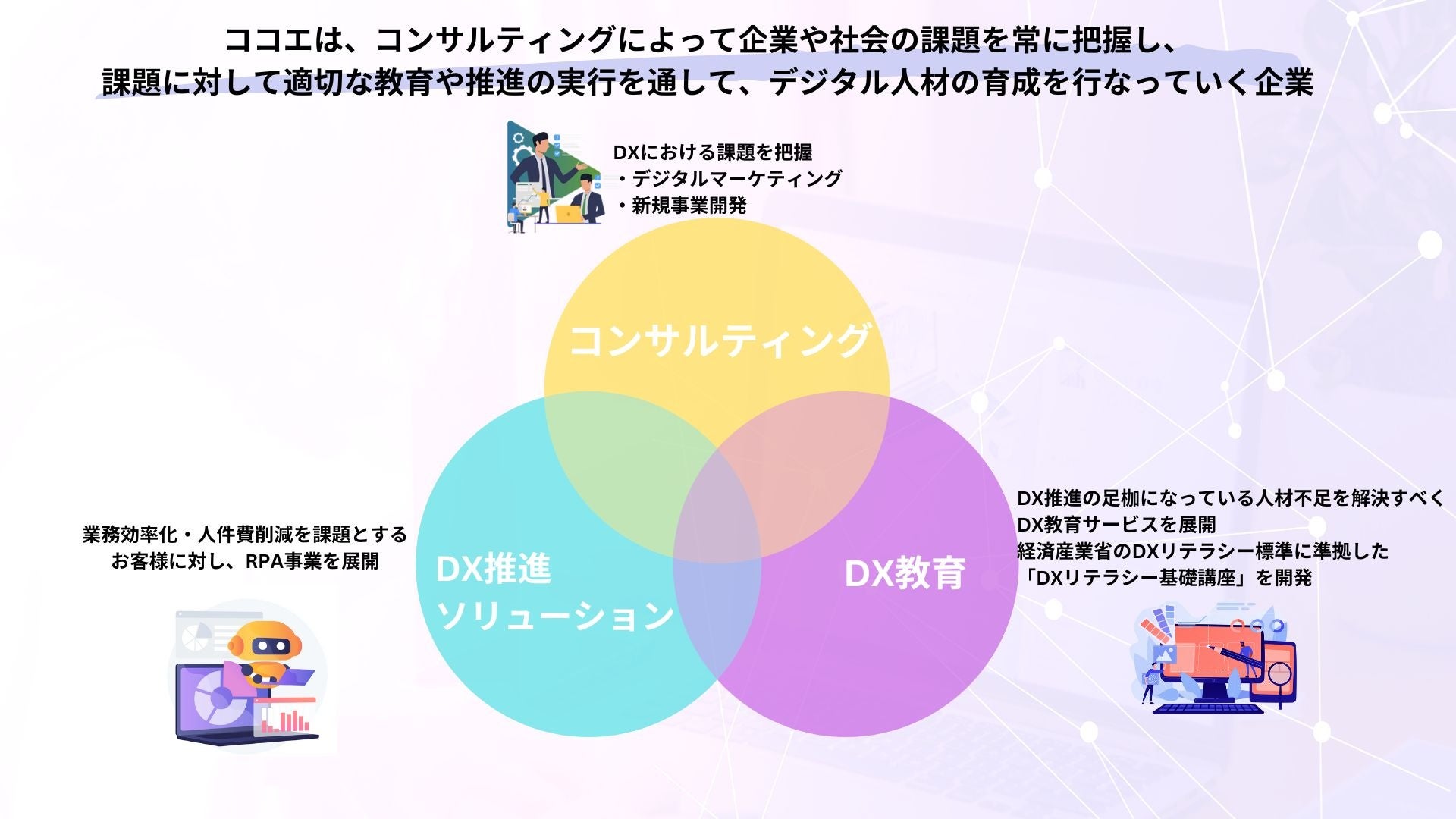これまで、DX推進に必要な人材育成を支援する『DX教育事業』を始め、お客様のニーズにフィットした事業を展開してまいりました。