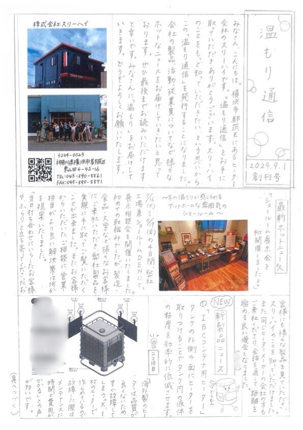 6月末の最終プレゼンテーションから、早くも3か月半が経ちました。当時営業部に配属された皆さんに、完成した営業誌を早くお見せしたいと思いながらも、試行錯誤を重ねて、ついにスリーハイの製品を購入してくださったお客様にお届けする営業誌「ぬくもり通信」第1号が完成しました。