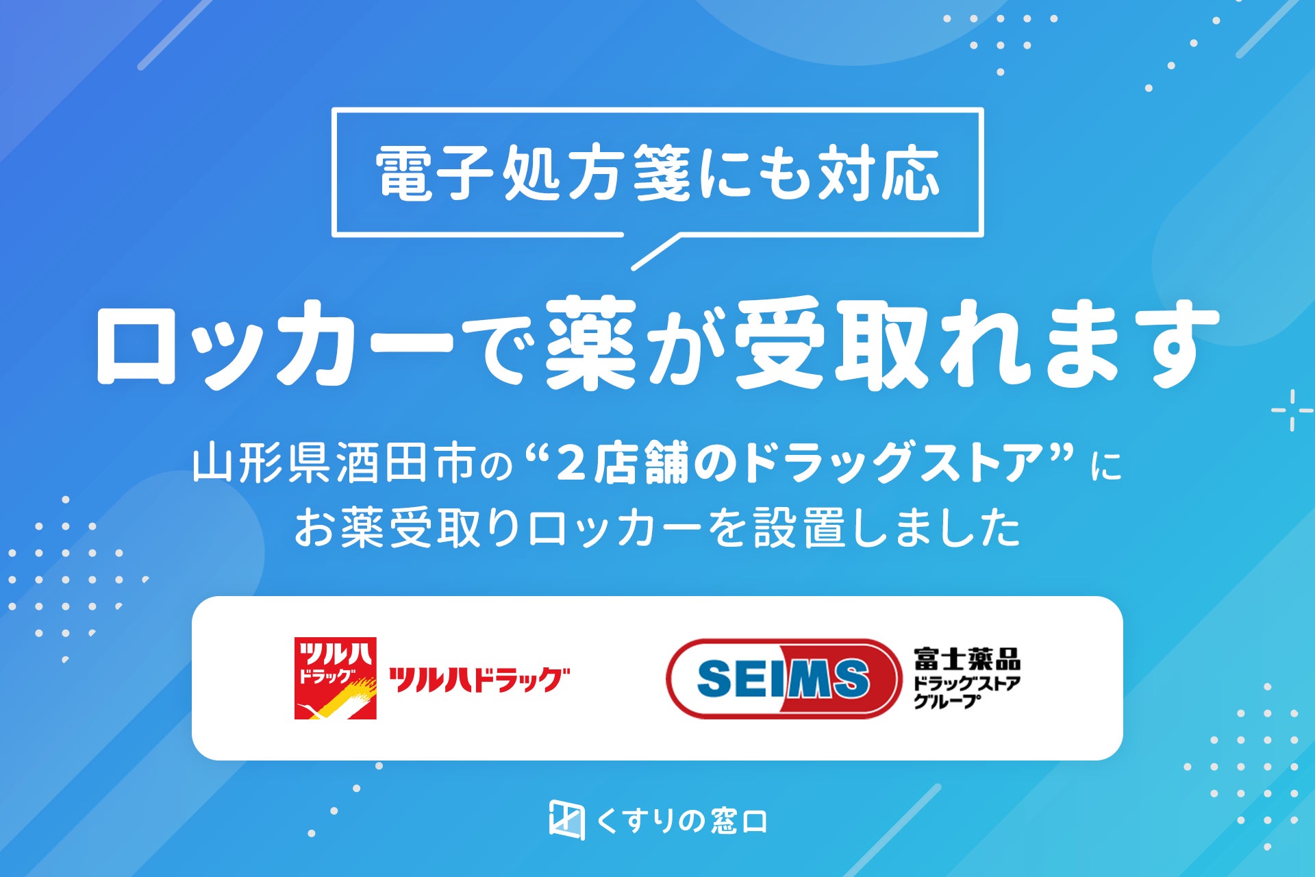 株式会社くすりの窓口(本社:東京都豊島区、代表取締役社長:堤 幸治、以下「当社」)は、電子処方箋対応のセルフ処方箋受付機および、お薬受取りロッカーを、「調剤薬局ツルハドラック酒田本町店」と「ドラッグセイムス酒田こがね店」に設置いたしましたことをお知らせいたします。