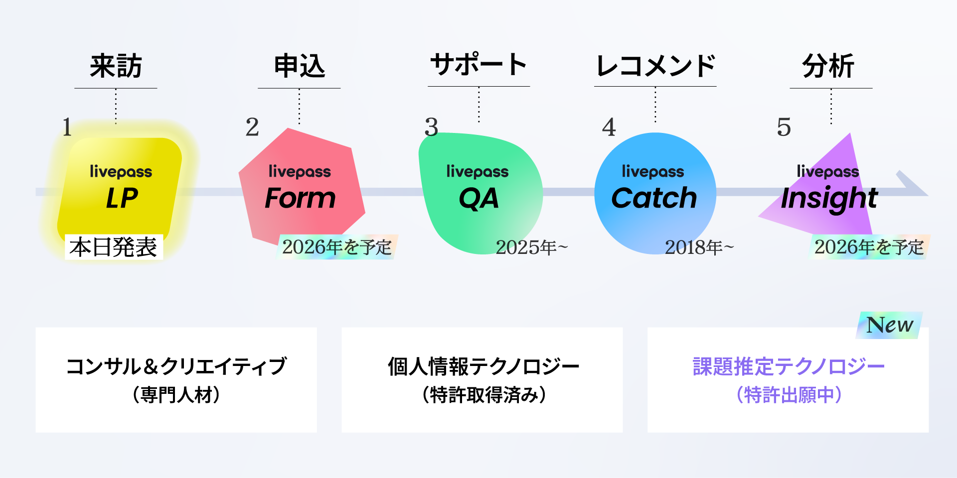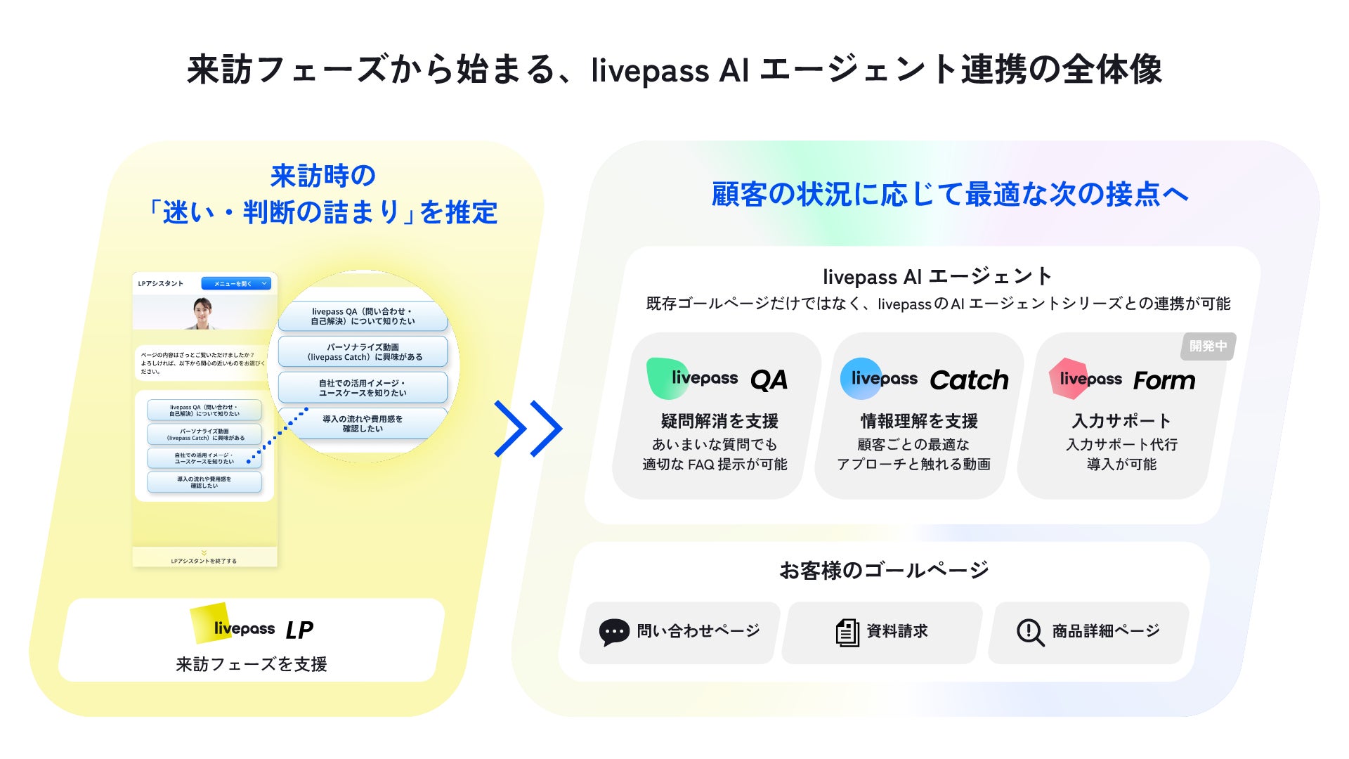 livepass LPはlivepass QA(疑問解消)、livepass Catch(理解支援)、開発中のlivepass Form(入力支援)と連携することで、LP上で推定された「迷い」や「判断の詰まり」を課題推定ログとして活用し、理解支援や疑問解消、入力サポートへと接続します。