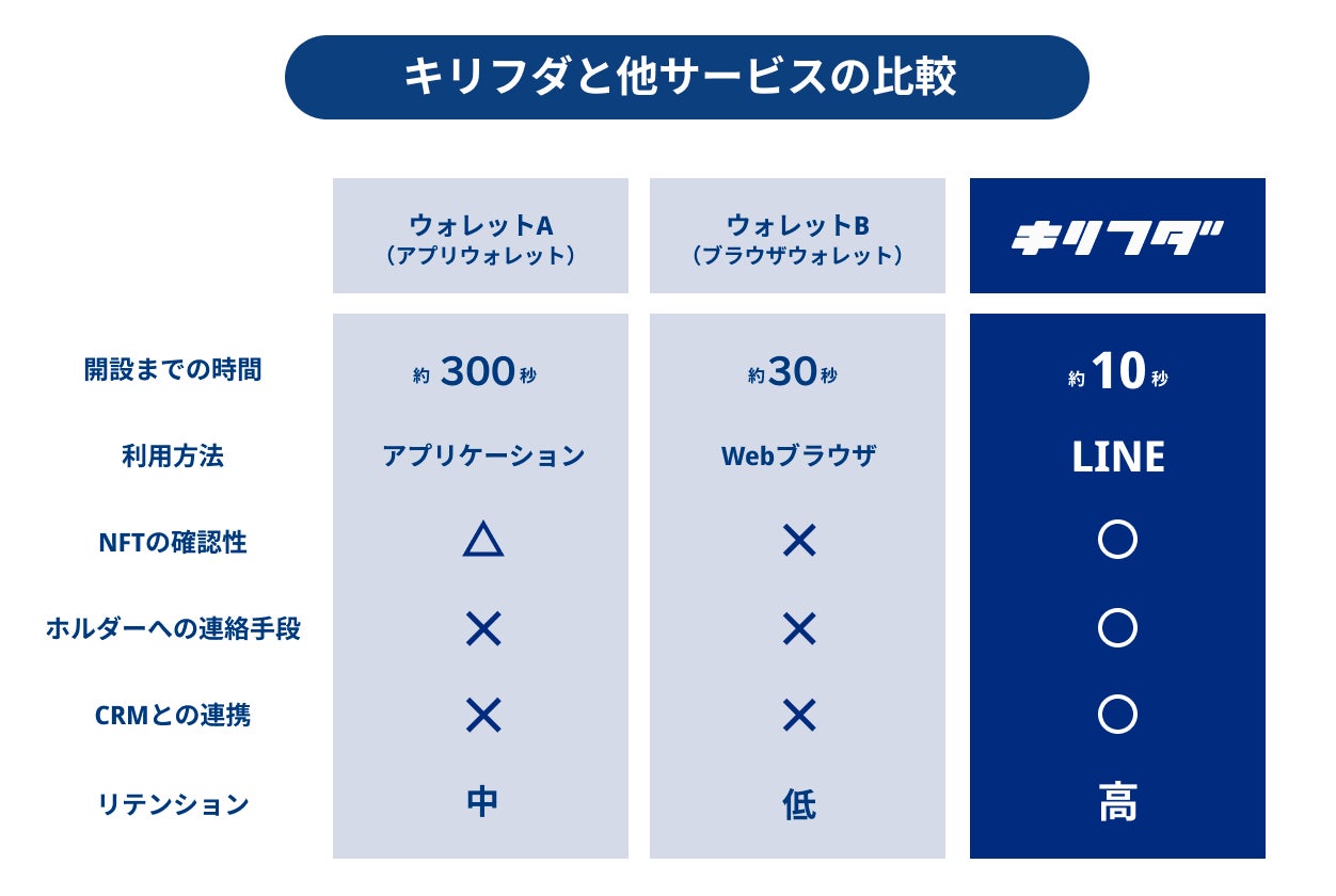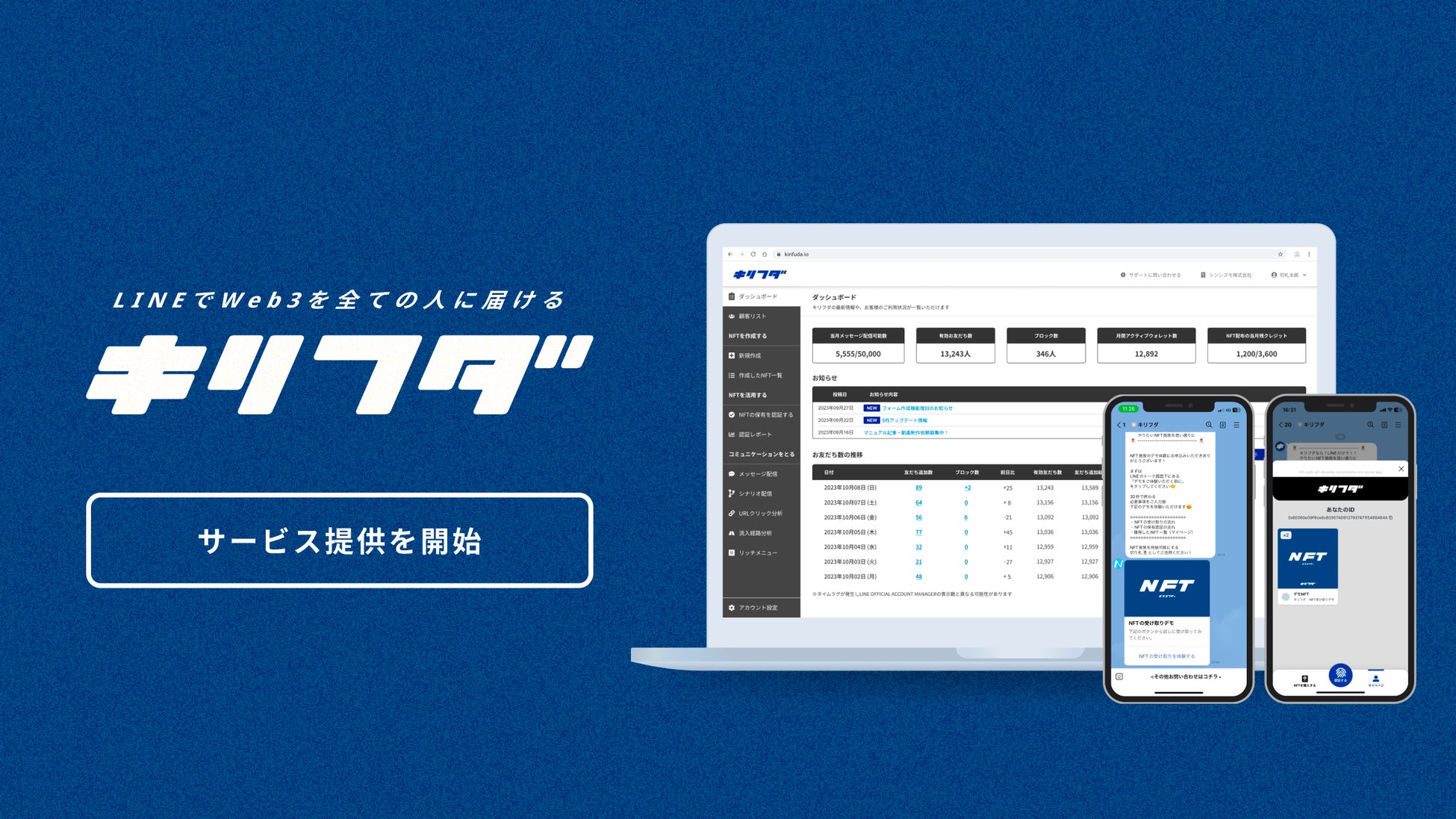 キリフダは、このような背景をもとに国内9000万人近くのユーザーが利用するLINE(*1)をベースとしてNFTに関わる体験を提供することで、多様な事業者が各社の事業領域にNFTを取り入れる基盤の構築を目指しています。