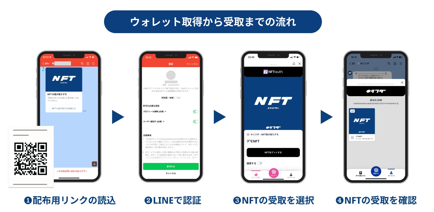 キリフダは、この課題を解決するために、NFTに関する様々なユーザー体験をLINEで完結させることで、ユーザーのオンボーディングを圧倒的に簡単にしています。ユーザーはLINE認証のワンクリックでウォレットを生成し、NFTの受け取りを行うことができます。
