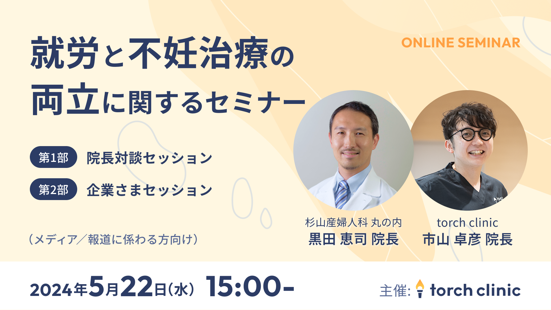 【プレスメディア関係者限定】2024年5月22日(水)15:00開始、オンラインセミナーのお知らせ。「就労と不妊治療の両立」をテーマに生殖医療専門医及び企業が対談。