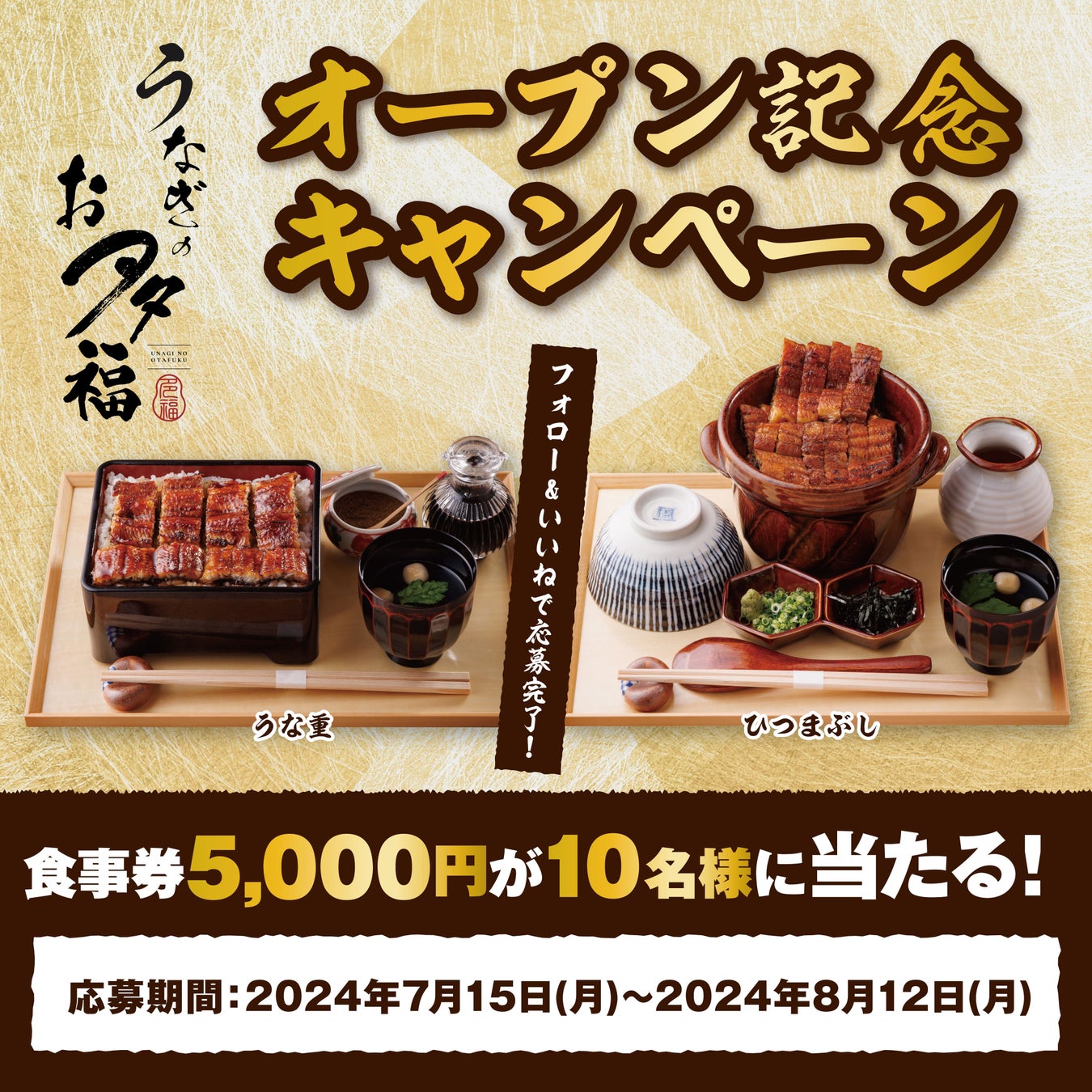 ①Instagram公式アカウントをフォローした方限定で、2024年7月24日(水)〜2024年7月25日(木)の2日間で「うな重 並(1980円)」を1日100食限定!!1000円でご提供致します。