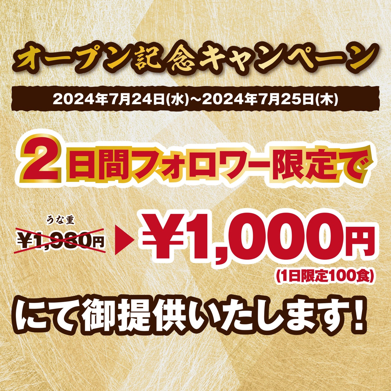 Instagram公式アカウントをフォローした方限定で、2024年7月24日(水)〜2024年7月25日(木)の2日間「うな重 並(1980円)」を1日100食限定!!1000円でご提供!