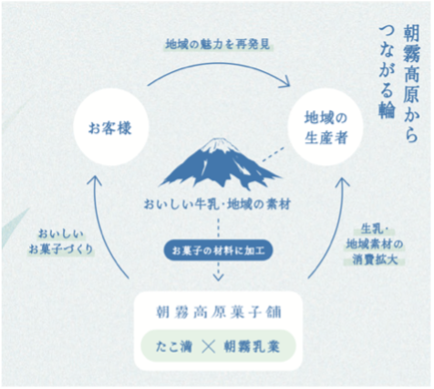 お菓子屋さんが乳業メーカーとタッグを組んだ一次産業直結スイーツブランド。富士山の麓、朝霧高原でとれた生乳をたっぷり使用、生乳を加工する上で出る副産物も使い、その美味しさを余すことなく活かしたお菓子を作り続けます。富士山や朝霧高原の自然をモチーフに、原材料・製法にこだわり一手間かけたお菓子を提供します。