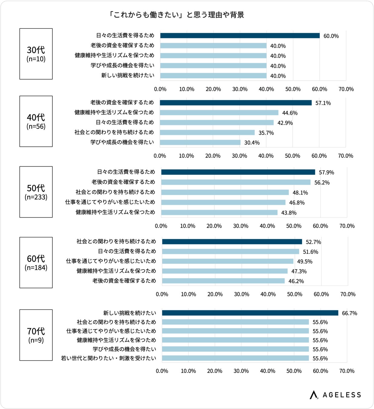 「これからも働きたい」と考える理由は、30〜50代は「金銭面」、60代は「社会との関わり」、70代は「学び・成長」を重視する傾向が明らかに