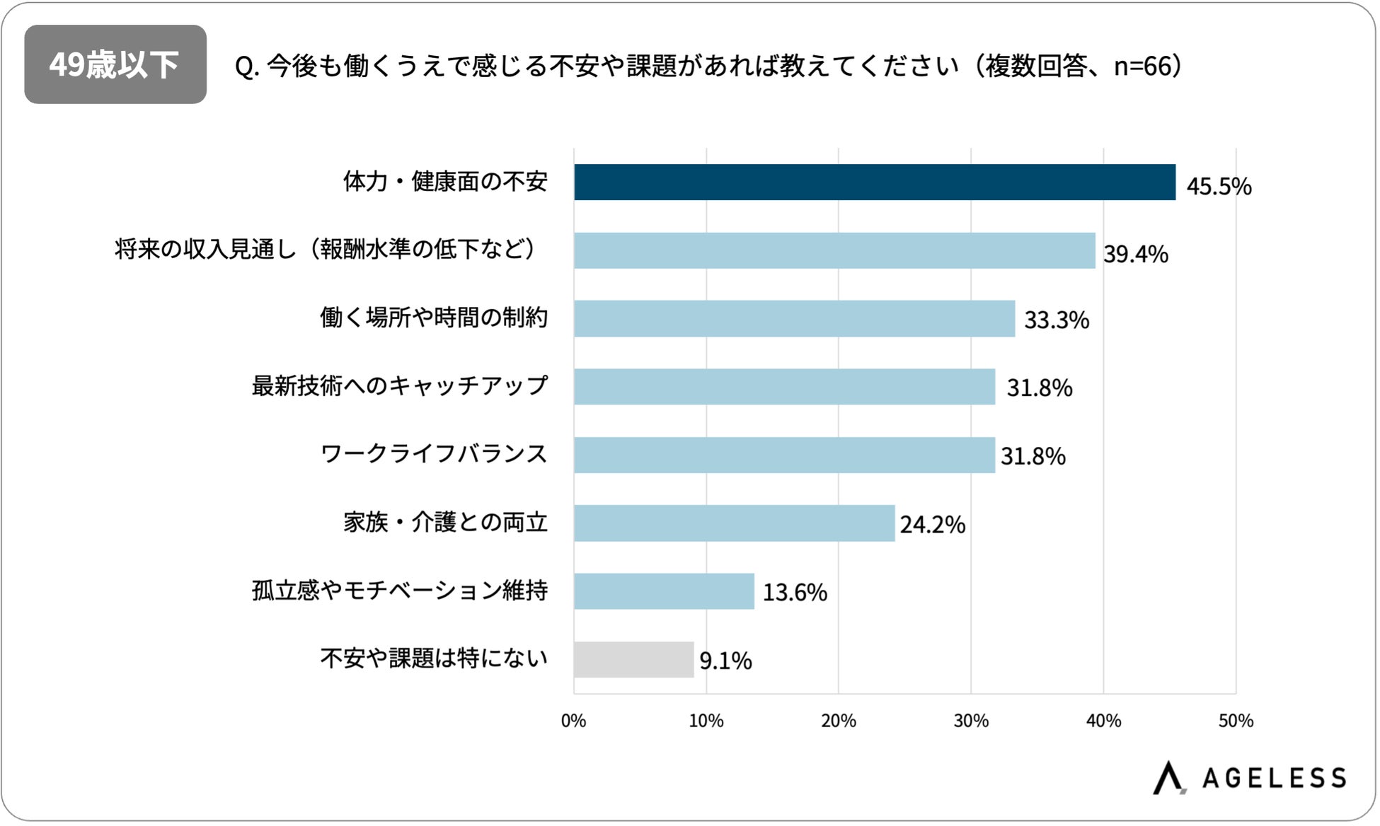 ● 今後働くうえでの不安は「収入見通しの低下」が最多(4割超)、49歳以下は「体力・健康」、65歳以上は「最新技術へのキャッチアップ」が最大の課題
