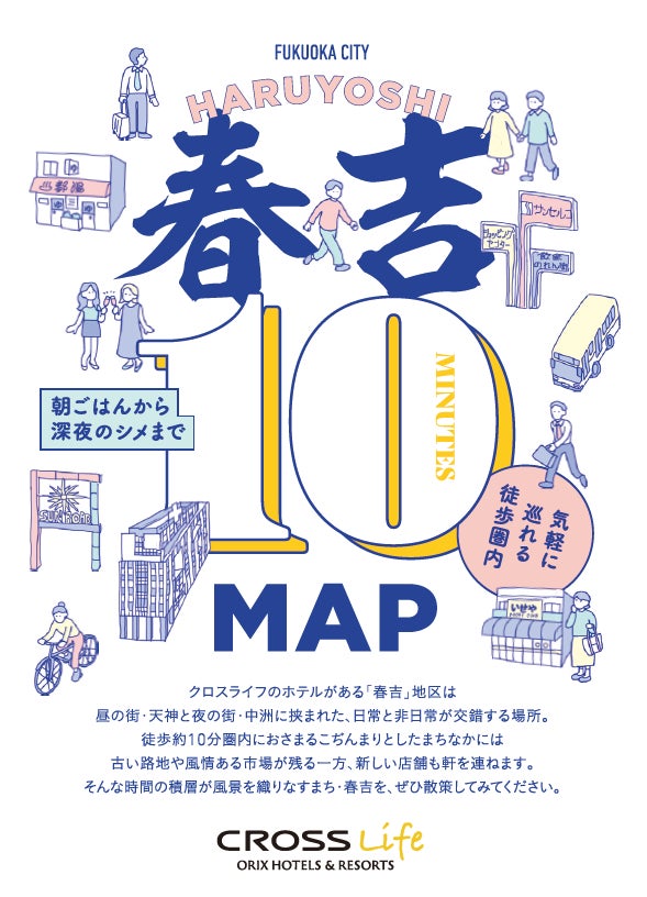 2つのクロスライフを結ぶ「春吉エリア」は、昼の街・天神と夜の街・中州に挟まれた、日常と非日常が交錯する場所であり、古き良き街並みが今も残ります。本MAPでは、各ホテルから徒歩10分圏内にある、お手頃かつ味自慢の個性的な飲食店やカフェなど地元ならではの情報をまじえて紹介しています。気軽に散策に行ける距離にあるおすすめスポットに、ぜひ足を運んでみてください。