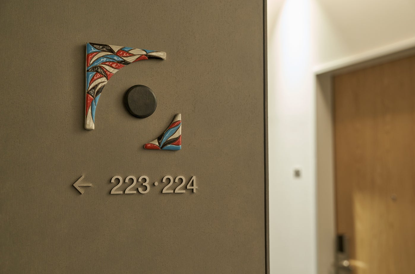 宿泊階でお客さまをお出迎えする階数表示と客室案内表示には、福岡の伝統的な焼き物である「小石原焼」の作品を用いています。小石原焼は、器をろくろで回しながら規則的に模様を入れる独特な幾何学的模様が特徴です。表示は13の窯元によって制作され、全て表現スタイルは異なります。伝統技法と革新性が組み合わさったデザインであり、小石原焼の奥深さに惹き込まれます。今後、クロスライフ博多柳橋では、小石原焼の体験機会を創出する予定です。