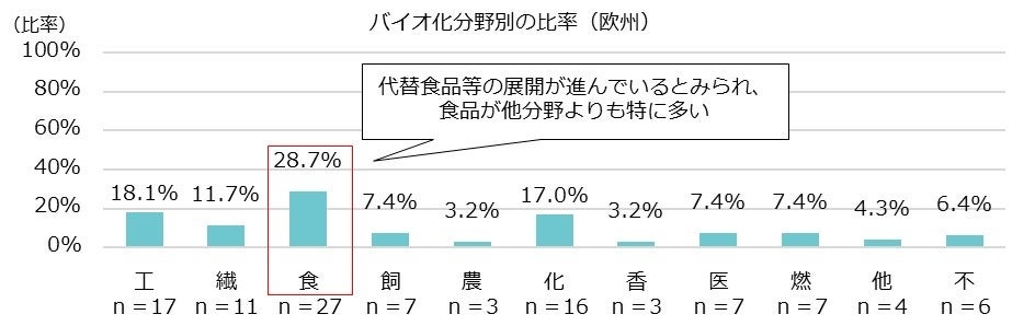 欧州は「食品」に関する事例が相対的に多くなっています。欧州では環境負荷低減と持続可能な食料システムへの転換が社会的課題となっており、植物性タンパク質や代替食品などの開発が政策と紐づきながら推進しやすい市場環境が構築されています。「工業化学」の比率が高い点は米国と同様の傾向であるものの、「化粧品」の事例が高い点は米国と異なるトレンドが現れています。