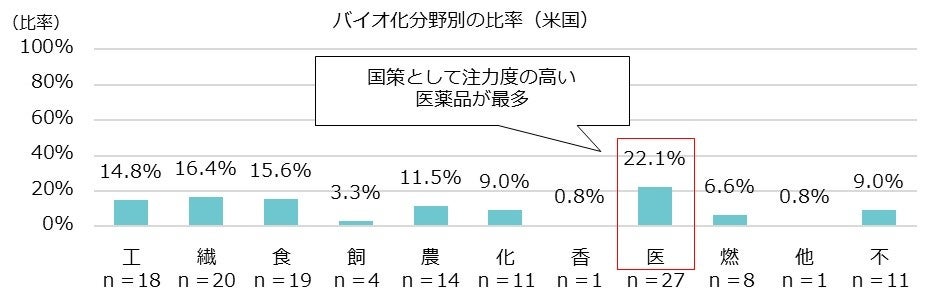 米国は「医薬品」の事例が相対的に多くなっています。米国政府が医療・ヘルスケア領域をバイオエコノミーの重点分野として位置づけていること、高齢化やがん治療への対応ニーズの高まり、高単価・高収益を狙いやすい投資対象としての市場の有望性などが影響しているとみられます。また、「工業化学」や「繊維」といった原料転換を図る分野でも技術開発が進んでいます。