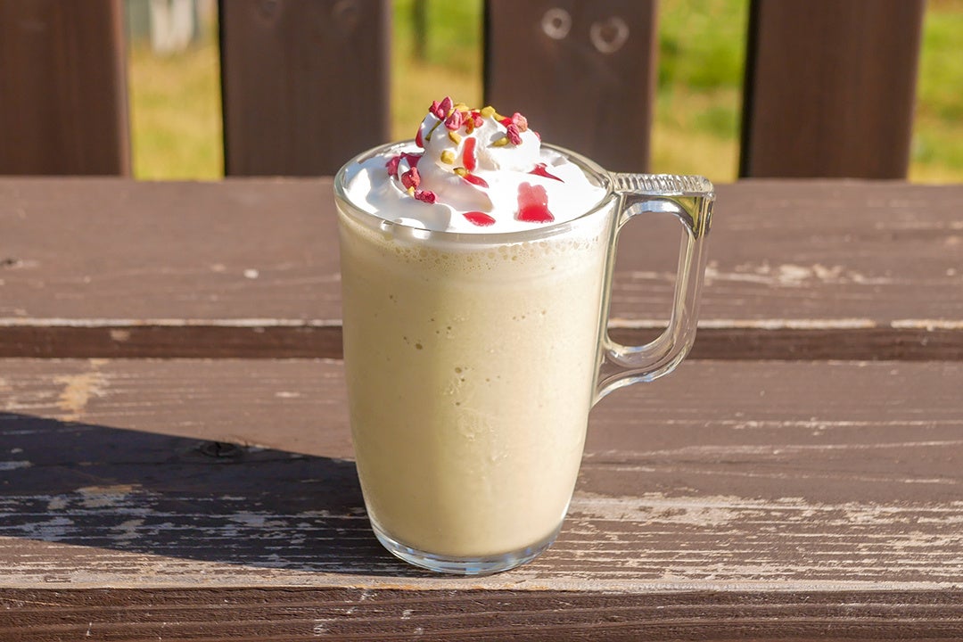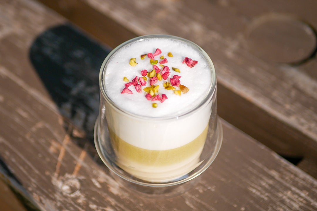 - 濃厚なピスタチオペーストに甘酸っぱいラズベリーがアクセントのクリスマスカラーを纏った12月限定ドリンク