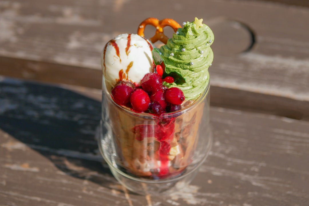 ふわふわの抹茶ホイップをクリスマスツリーに見立て、ゴロゴロのクランベリー果実と濃厚なアイスクリームを添えました。パフェの下は、甘酸っぱいフランボワーズシャーベットとベリーソース入りで、風味豊かなチョコレートアイスとの相性も抜群です。ザクザク食感のナッツがアクセントのクリスマスシーズンを盛り上げる一品です。