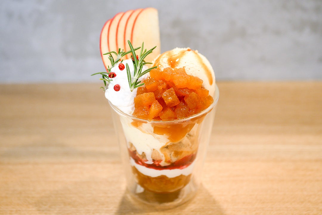 シャキシャキとしっとり!食感が違う2種類のりんごが楽しめる12月限定「タルトタタン風パフェ」