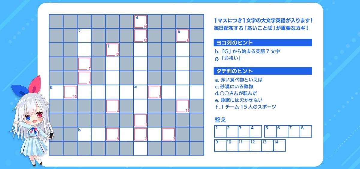 [1]毎日公式X(旧Twitter)で投稿された「あいことば」をヒントに交差しているマスを埋めていく