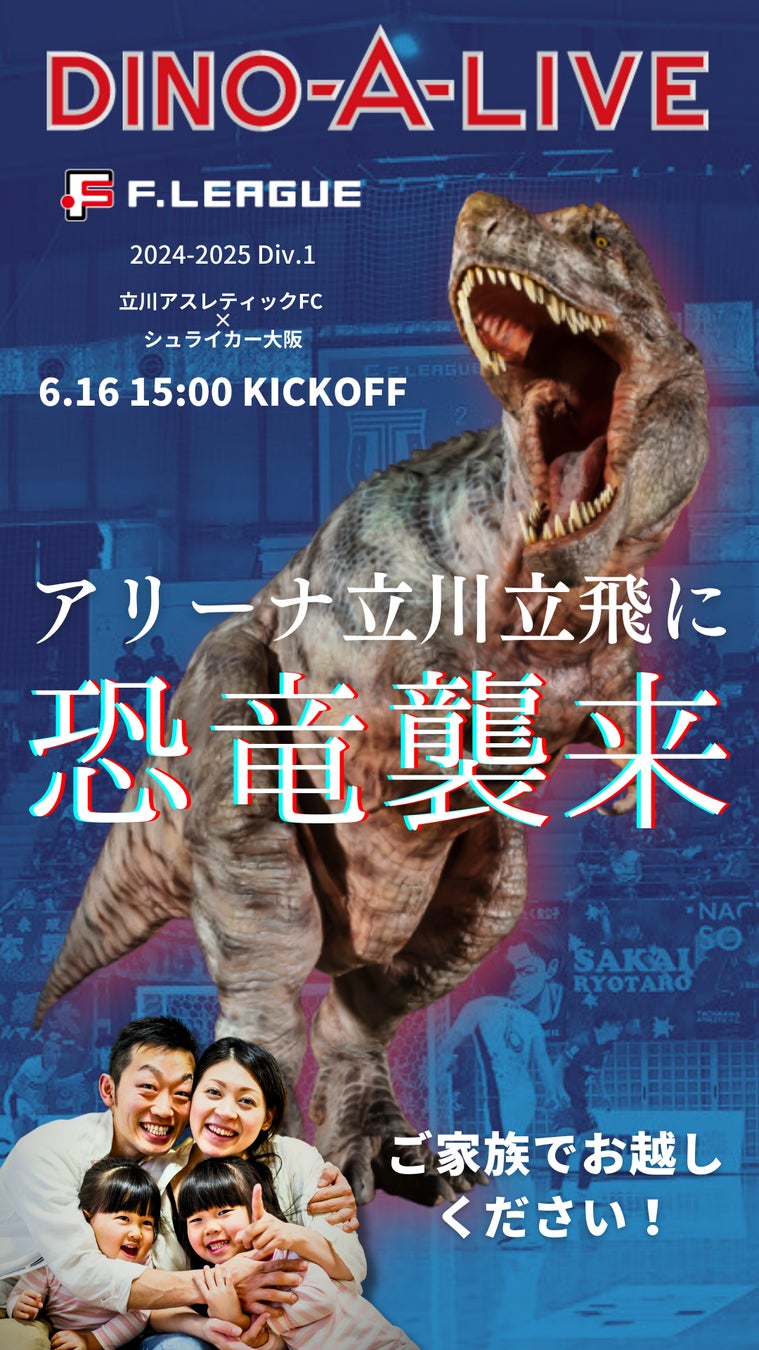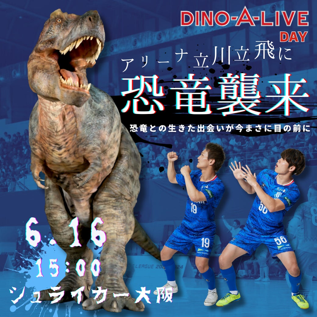 「スポーツで、人生に大きな夢と、毎日に小さな彩りを」を理念に掲げ、立川市を拠点に活動するFリーグ所属のフットサルクラブ「立川アスレティックFC」(本拠地:東京都立川市・代表理事:皆本晃、以下立川アスレティックFC)は、2024年6月16日(日)にアリーナ立川立飛にて開催されるFリーグ 2023-2024 ディビジョン1 第3節 シュライカー大阪戦(15:00)において、株式会社ON-ART様をマッチデースポンサーに「DINO-A-LIVE DAY」を開催することになりましたので、お知らせいたします。