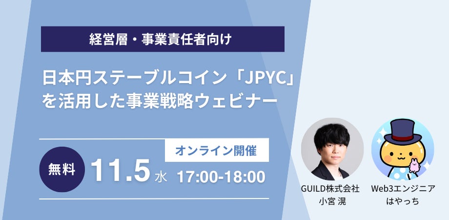 本プレスリリースの公開を記念し、日本円ステーブルコイン「JPYC」を活用した事業にご興味をお持ちの皆様を対象に、無料ウェビナーを開催いたします。 本ウェビナーでは、本サービスの詳細に加え、ステーブルコイン市場の最新動向、具体的なユースケース、そして法規制を踏まえたWeb3ビジネスの構築戦略について、分かりやすく解説します。