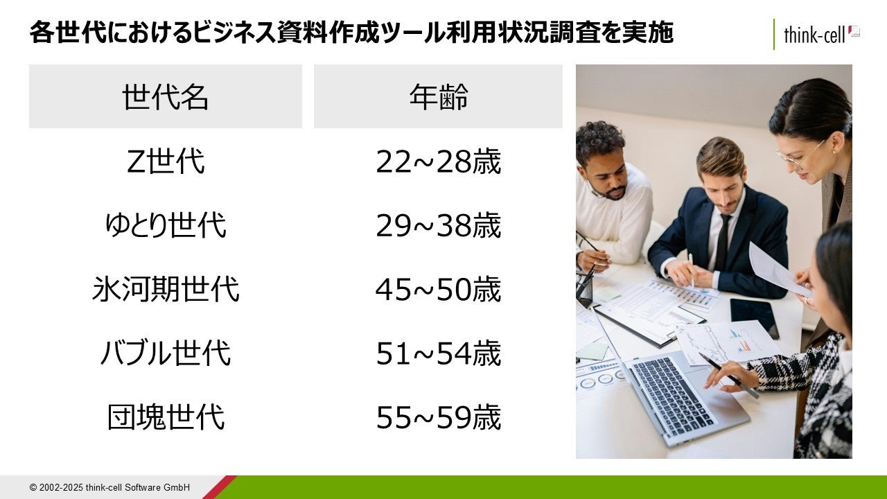 PowerPoint(以下パワポ)作業のオールインワンソリューション「think-cellスイート」を提供するthink-cell Japan株式会社(シンクセルジャパン、本社:東京都千代田区、代表取締役:松塚展国、以下think-cell Japan)は、日本全国の22~59歳の大卒社会人男女800名を対象とした職場でのデジタルツールの利用実態調査を行い、Z世代やゆとり世代といった世代別での資料作成におけるデジタルツールの利用状況の違いを浮き彫りにしました。