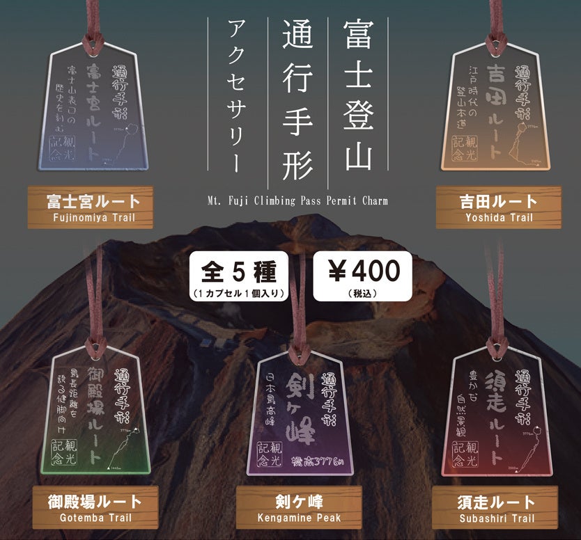 本商品は、江戸時代の通行手形をモチーフにした五角形のアクリル製アクセサリーです。富士登山の代表的なルート(剣ヶ峰、吉田、須走、御殿場、富士宮)をテーマに、各ルートごとに異なるデザインを展開。登山経験そのものをビジュアルに記録する「小さな証」として提案しています。
