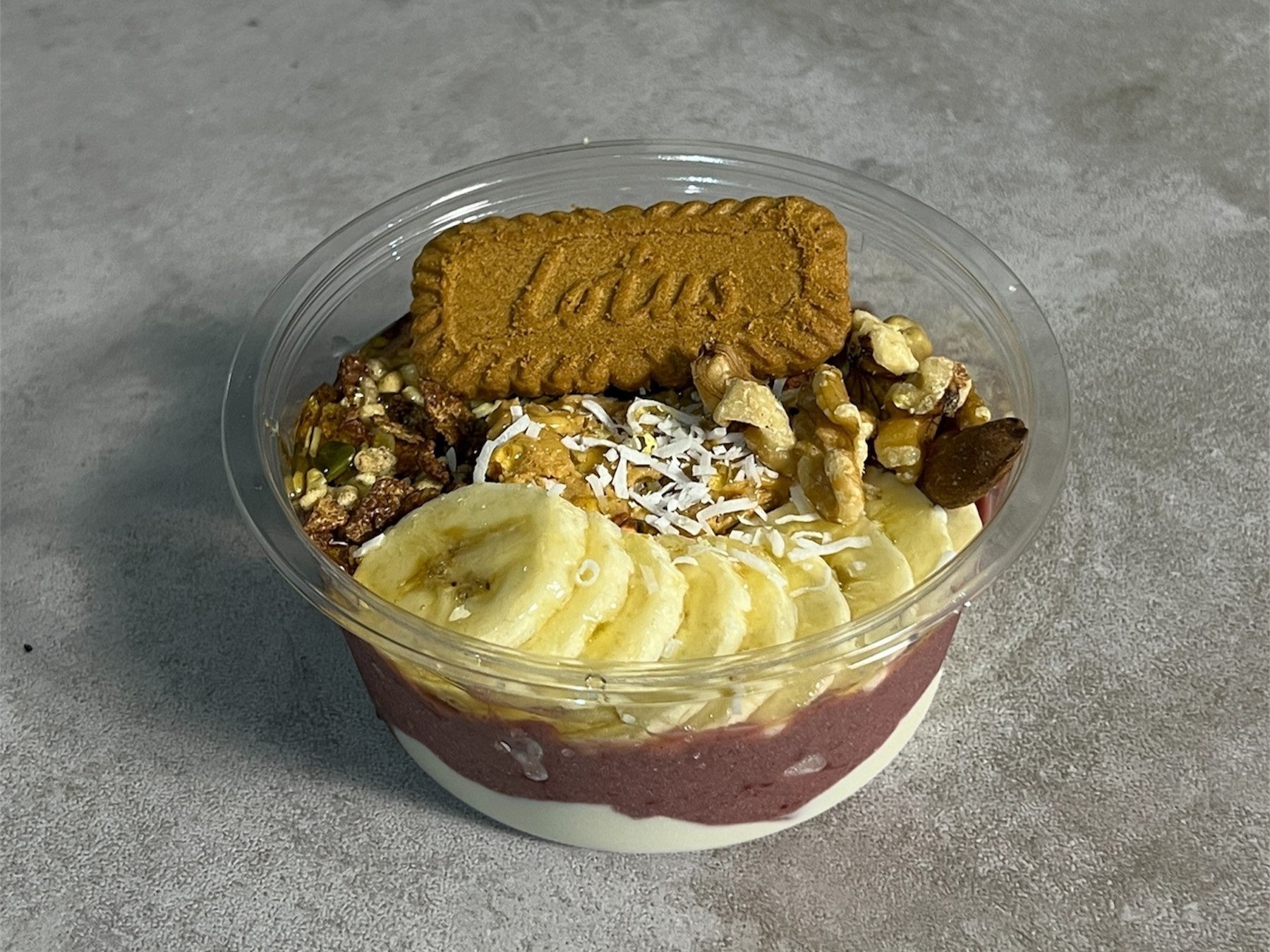 ピーナッツバターがアクセントのボウル。グラノーラにバナナ、ピーナッツバターを混ぜ、ロータス、ココナッツ、はちみつをトッピングしました。