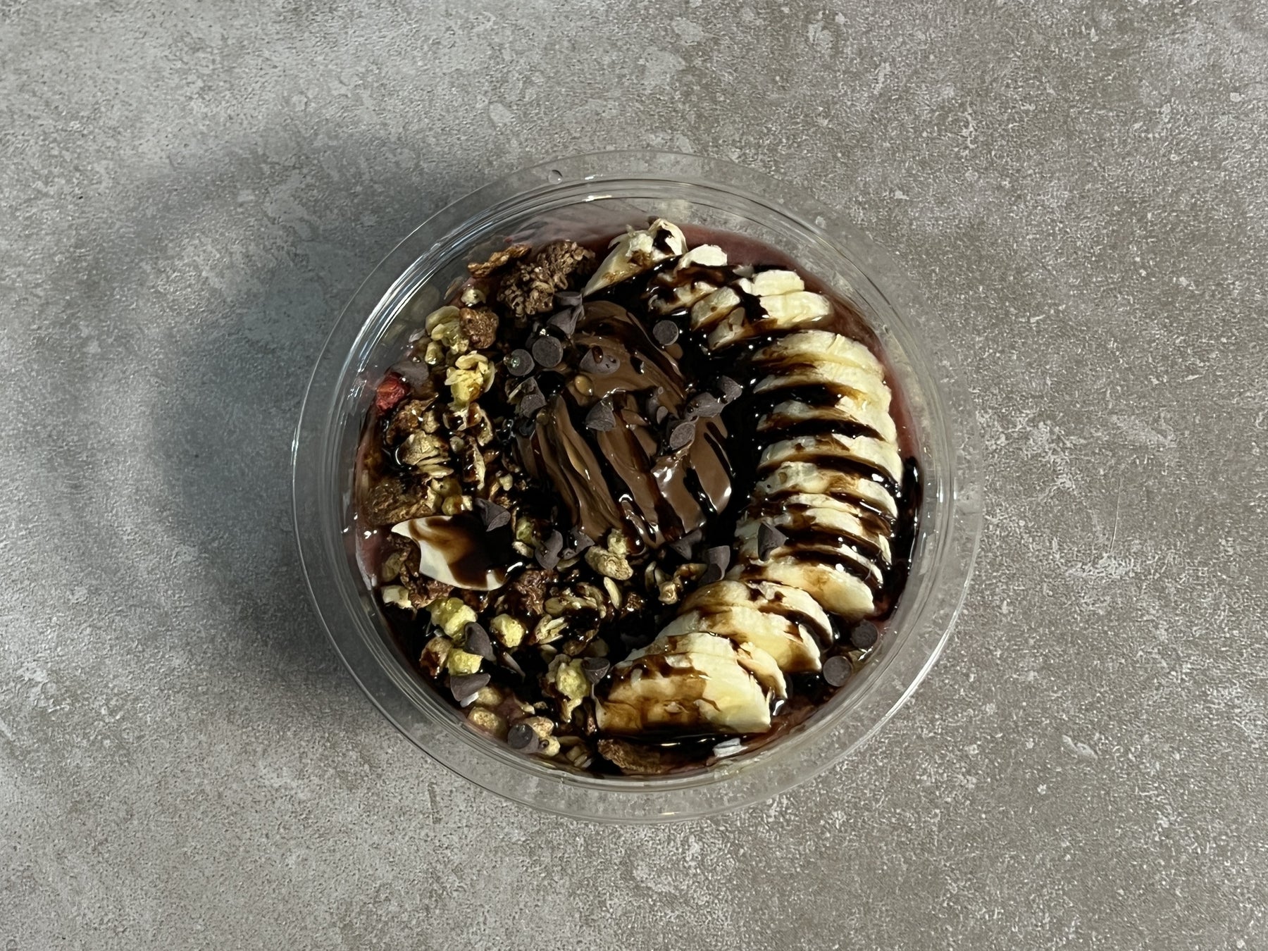 バナナをまるごととヌテラをたっぷり使用したボウル。グラノーラにバナナ、ヌテラを混ぜ、チョコチップとチョコソースをトッピングしました。