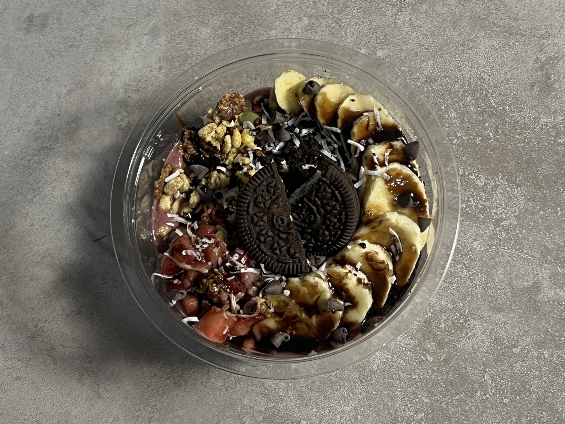 オレオをふんだんに使用したボウル。グラノーラにバナナ、いちご、ココナッツ、オレオクラム、オレオを混ぜ、チョコチップとチョコソースをトッピングしました。