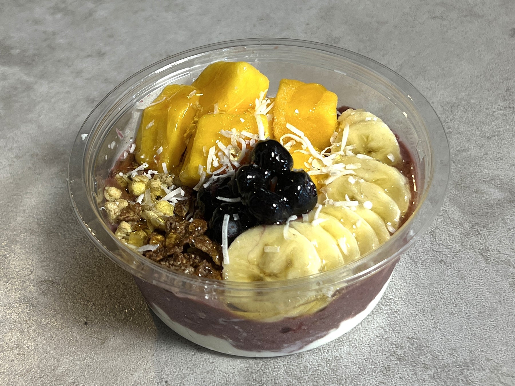 完熟マンゴーをたっぷり使用。他にも、バナナ、ブルーベリー、ココナッツ、はちみつで味付けしました。