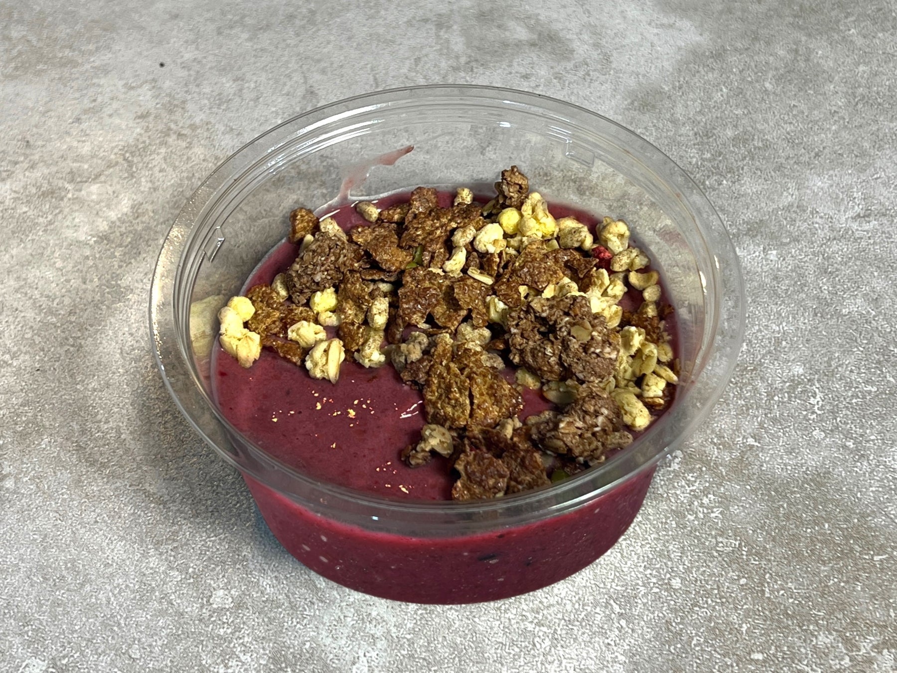 お店1番のおすすめ。いちごチョコグラノーラをベースに、バナナ、いちご、ブルーベリー、ココナッツ、チョコチップを使用し、はちみつとハートチョコをトッピングしました。