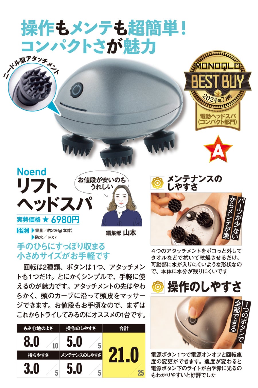 毎分150回の音波振動×360°回転する4つのヘッドでプロの技術を再現。様々な商品を徹底的に検証するモノ批評誌『MONOQLO』にて、電動ヘッドスパ(コンパクト部門)のBestbuyを獲得したヘッドマッサージャー。