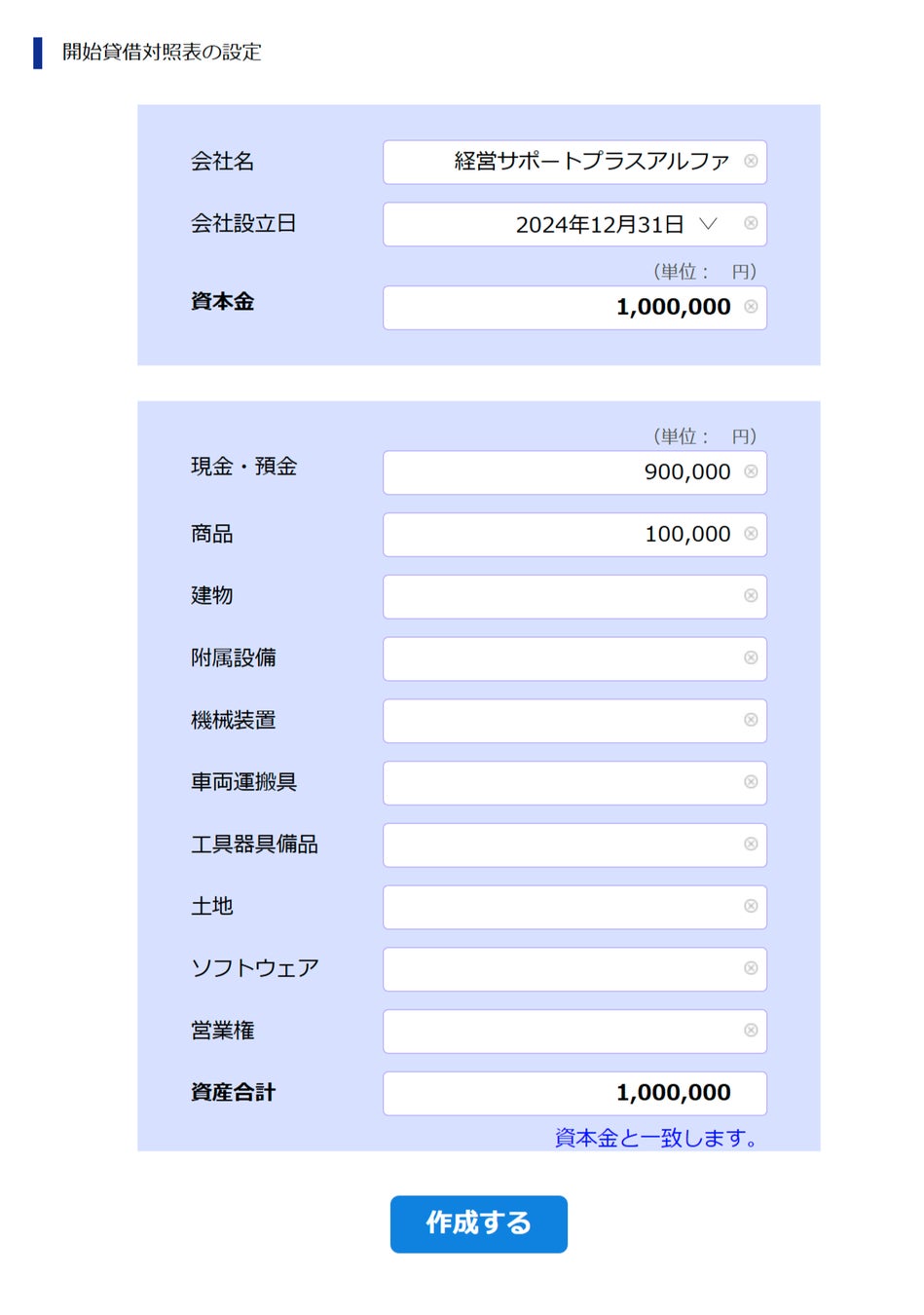 開始貸借対照表を作成する際は、会社名や会社設立日、資本金とその詳細をフォームに沿って入力します。