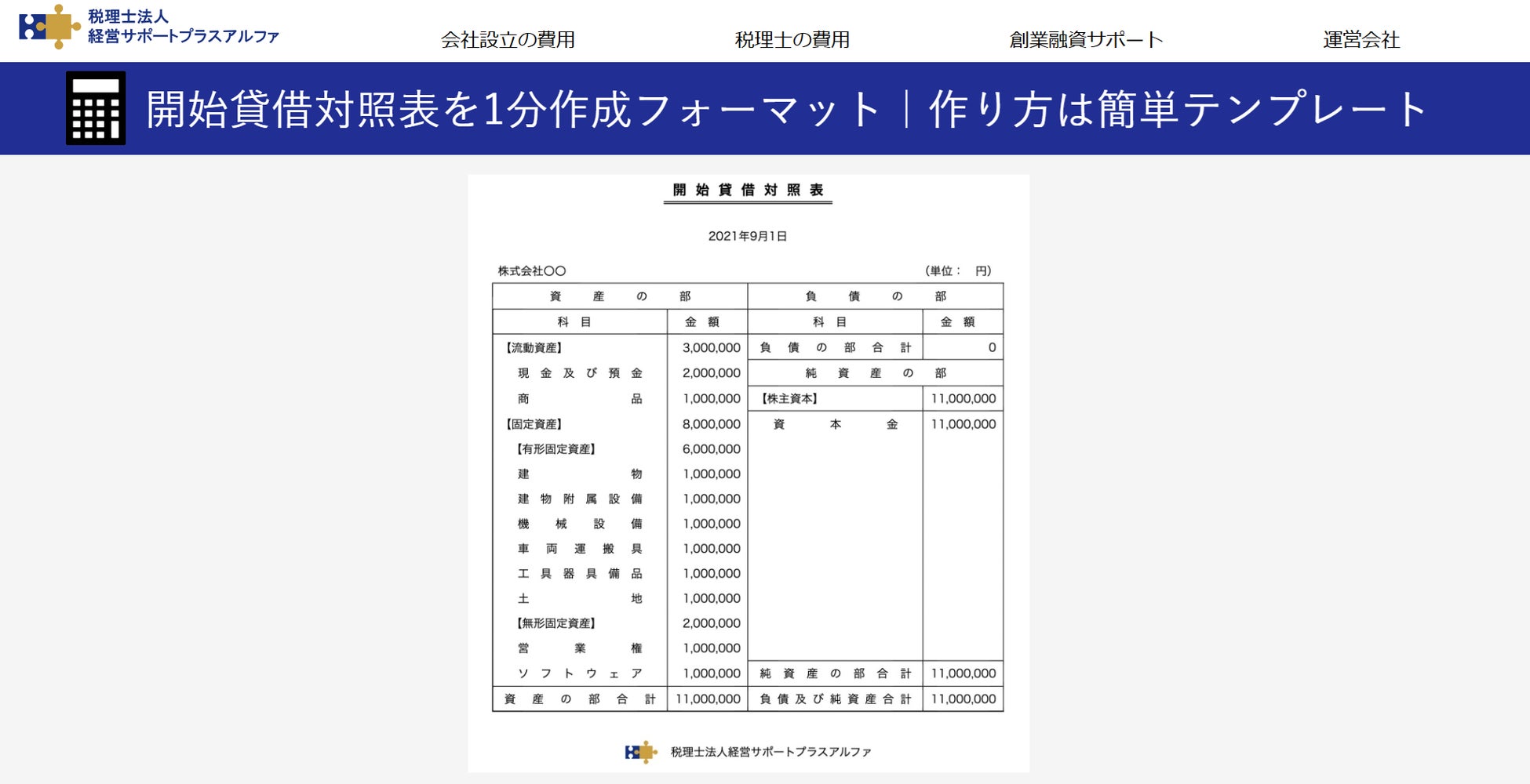 「開始貸借対照表を1分作成フォーマット」ツール:https://keiei-support-plus-a.com/zeirishi-hiyou/kaishi_taishaku_taishouhyou/