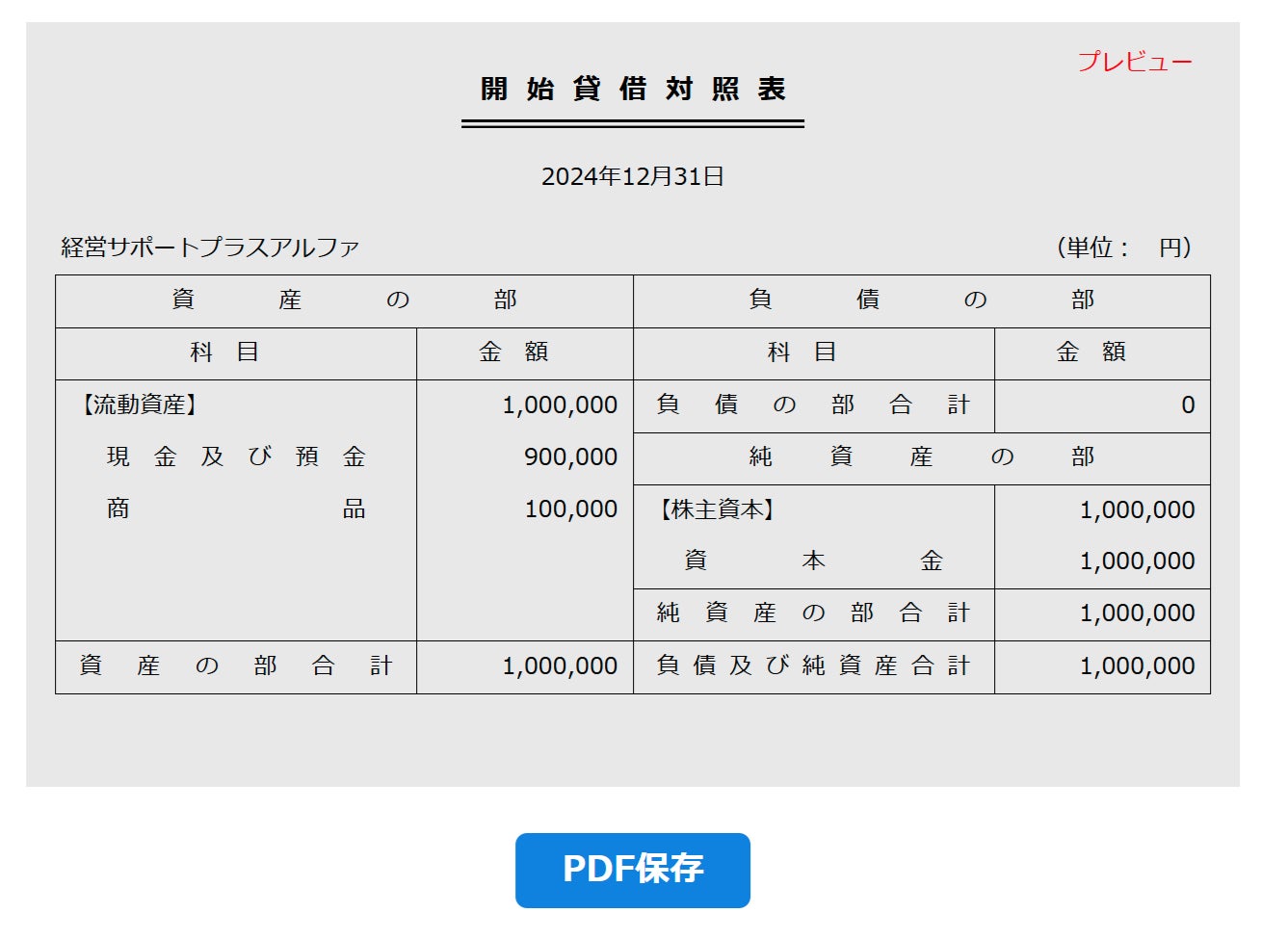 作成するをクリックすると、開始貸借対照表のプレビューが表示されます。想定通りであれば、PDFとして保存し、お使いください。