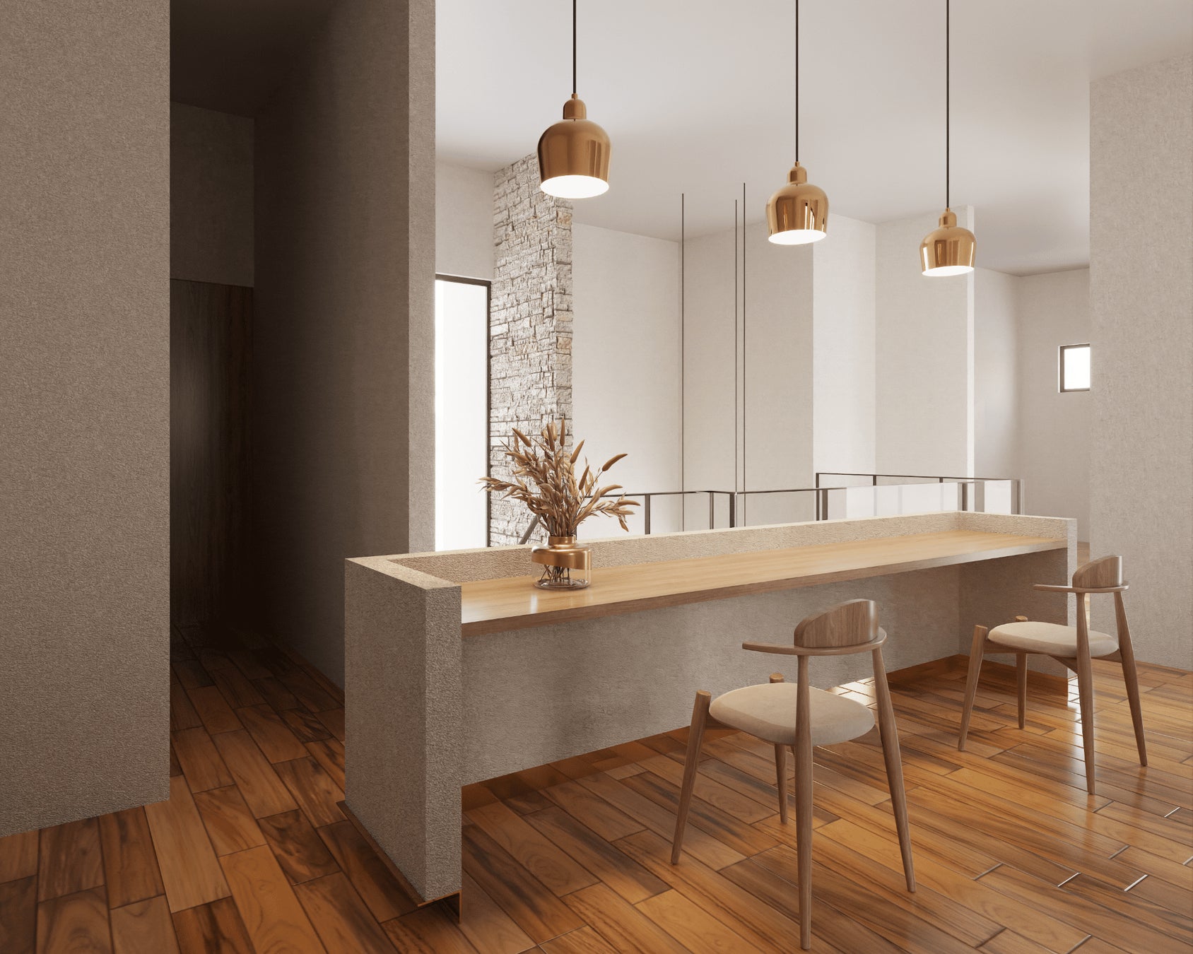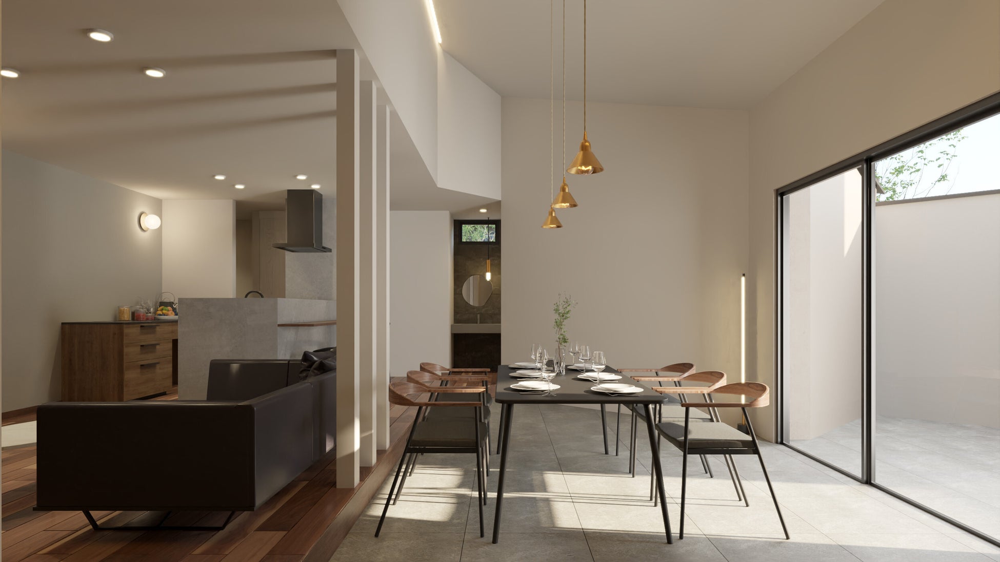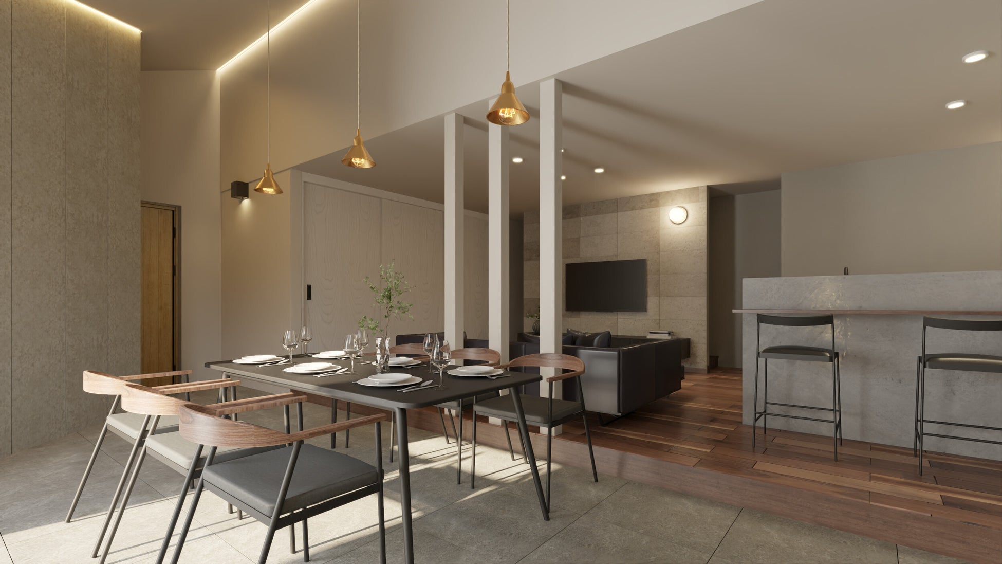 玄関からダイニングへの境を無くし、ダイニング空間を強く感じる空間デザイン。段差、天井差、視線、化粧柱に細かな工夫を設け、建具を設置しなくても別空間にいるように感じられる設計に。