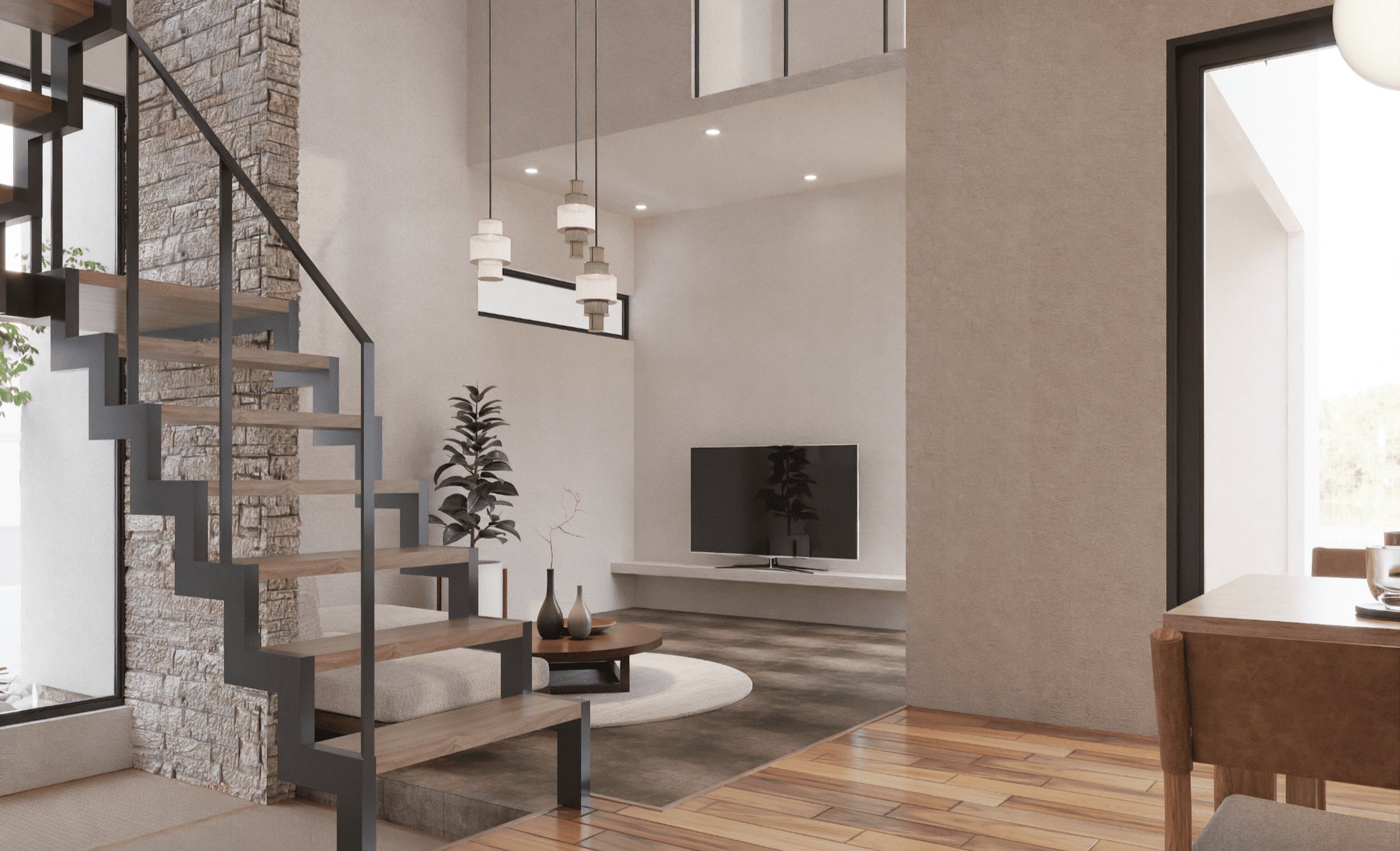 大きな吹抜けとスケルトン階段で圧倒的な開放感を演出しつつも、適度なスキップフロアで